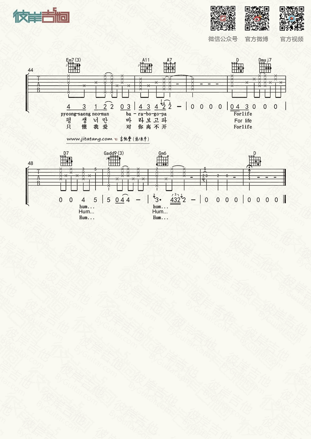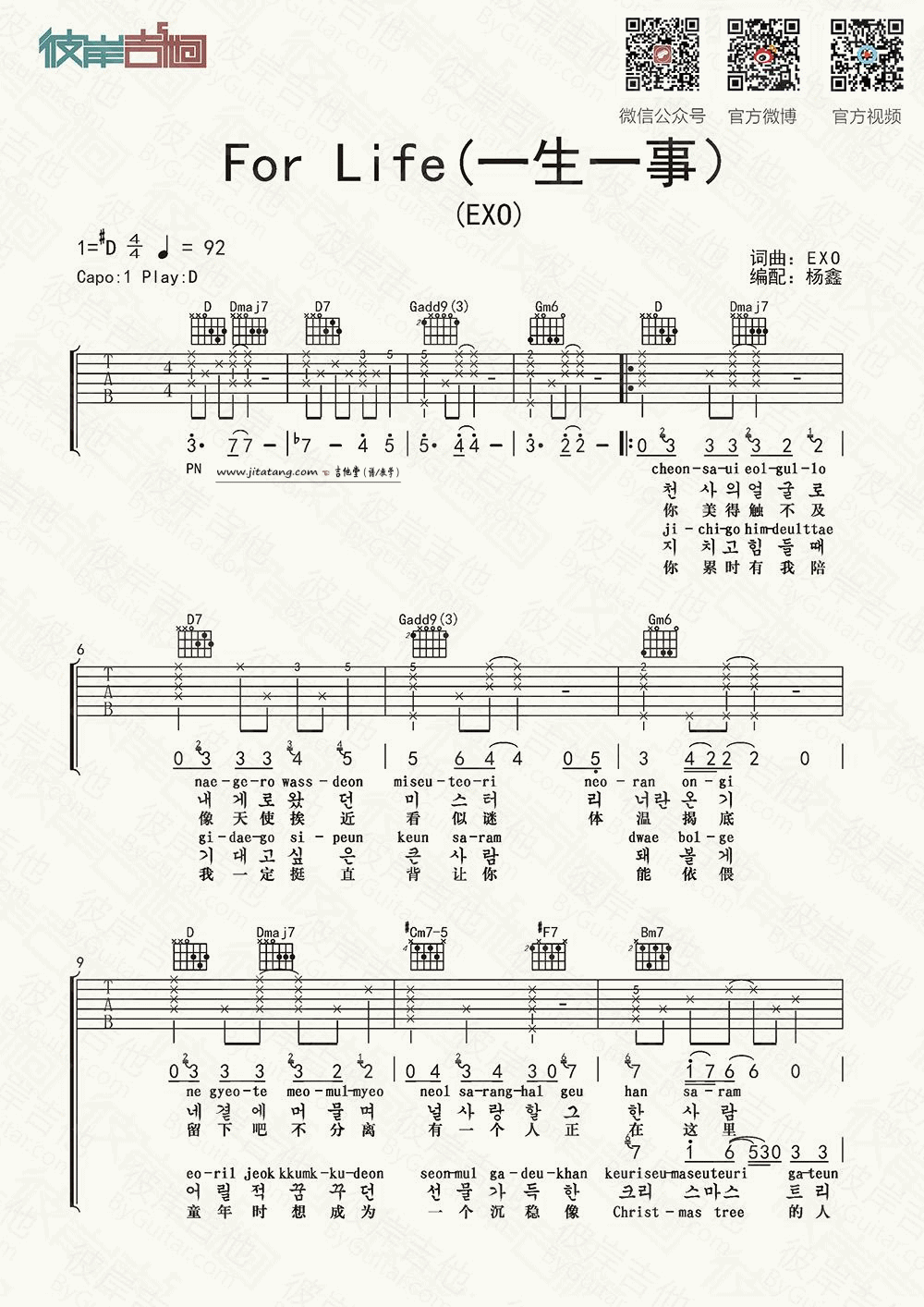 曲谱介绍: for《forlife》吉他弹唱谱,采用D调指法编配,彼岸吉他编配出品,共有5张高清图谱。