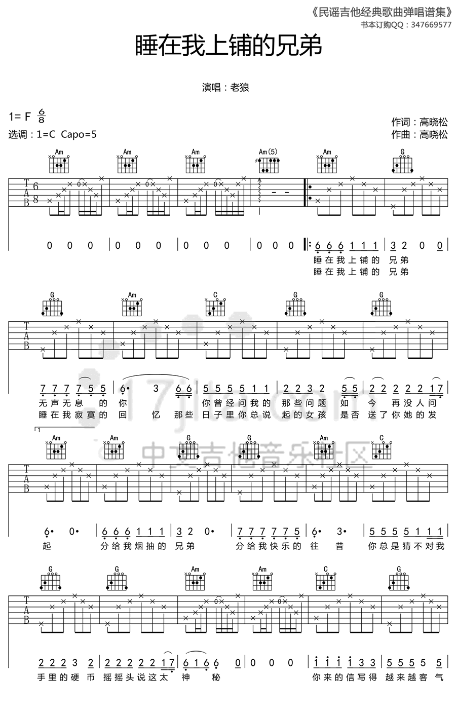 曲谱介绍: 老狼《睡我上铺的兄弟》吉他弹唱谱,采用F调指法编配,民谣吉他编配出品,共有3张高清图谱。