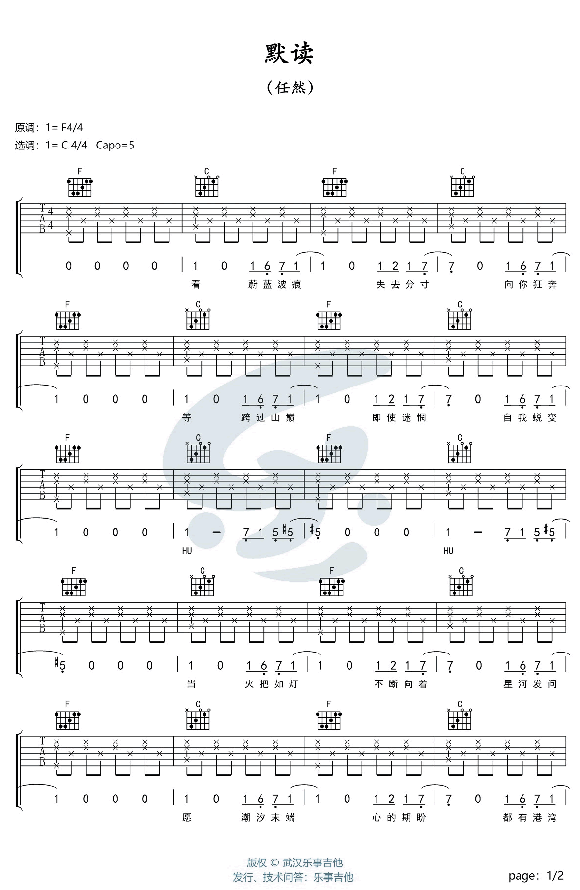 曲谱介绍: 任然《默读》吉他弹唱谱,采用C调指法编配,乐事吉他编配出品,共有2张高清图谱,免翻页排版设计。