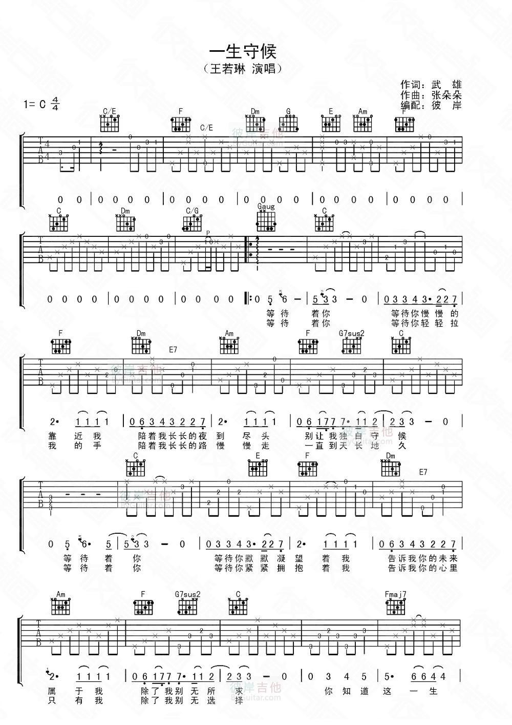 曲谱介绍: 王若琳《一生守候》吉他弹唱谱,采用C调指法编配,彼岸吉他编配出品,共有2张高清图谱,免翻页排版设计。