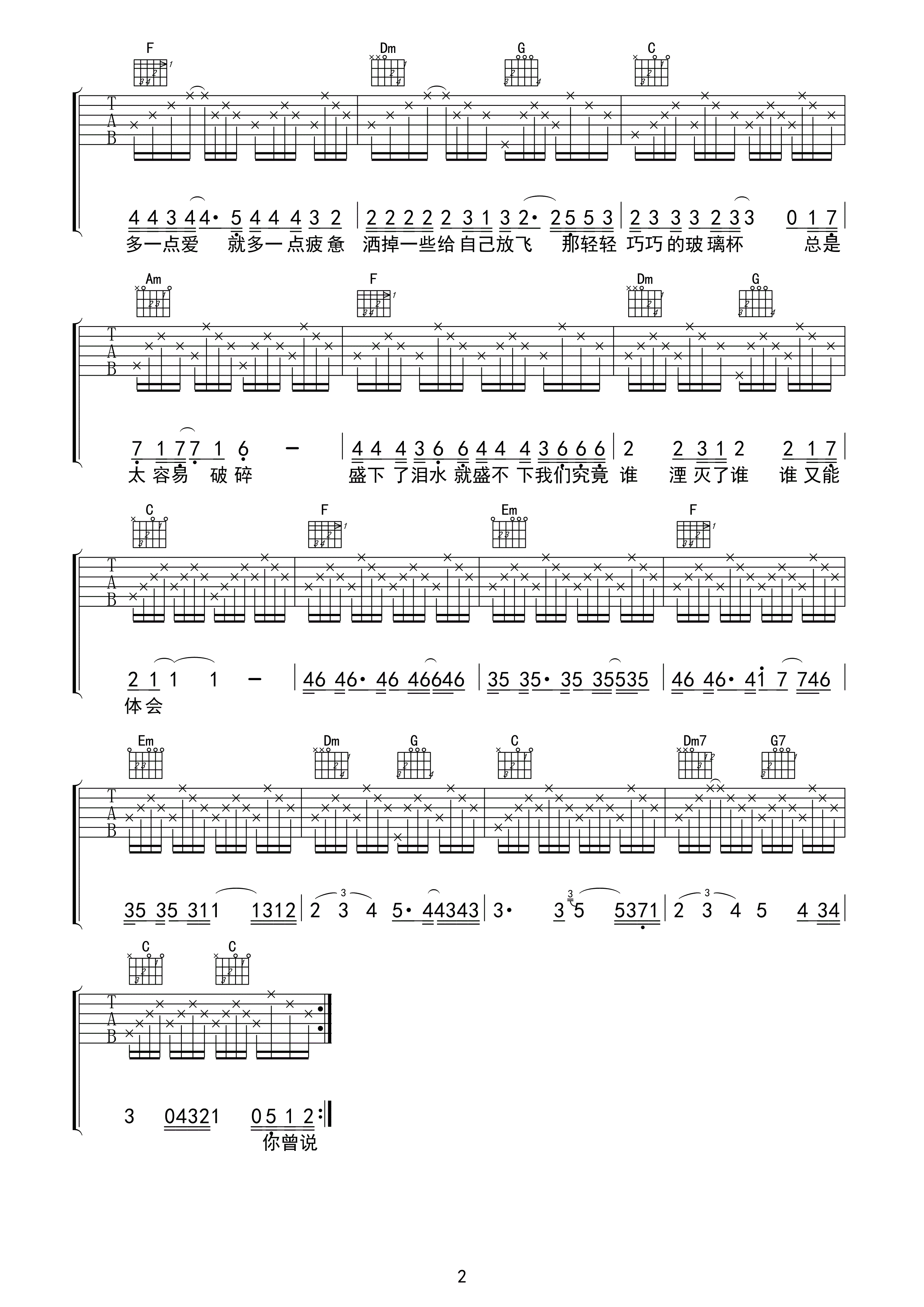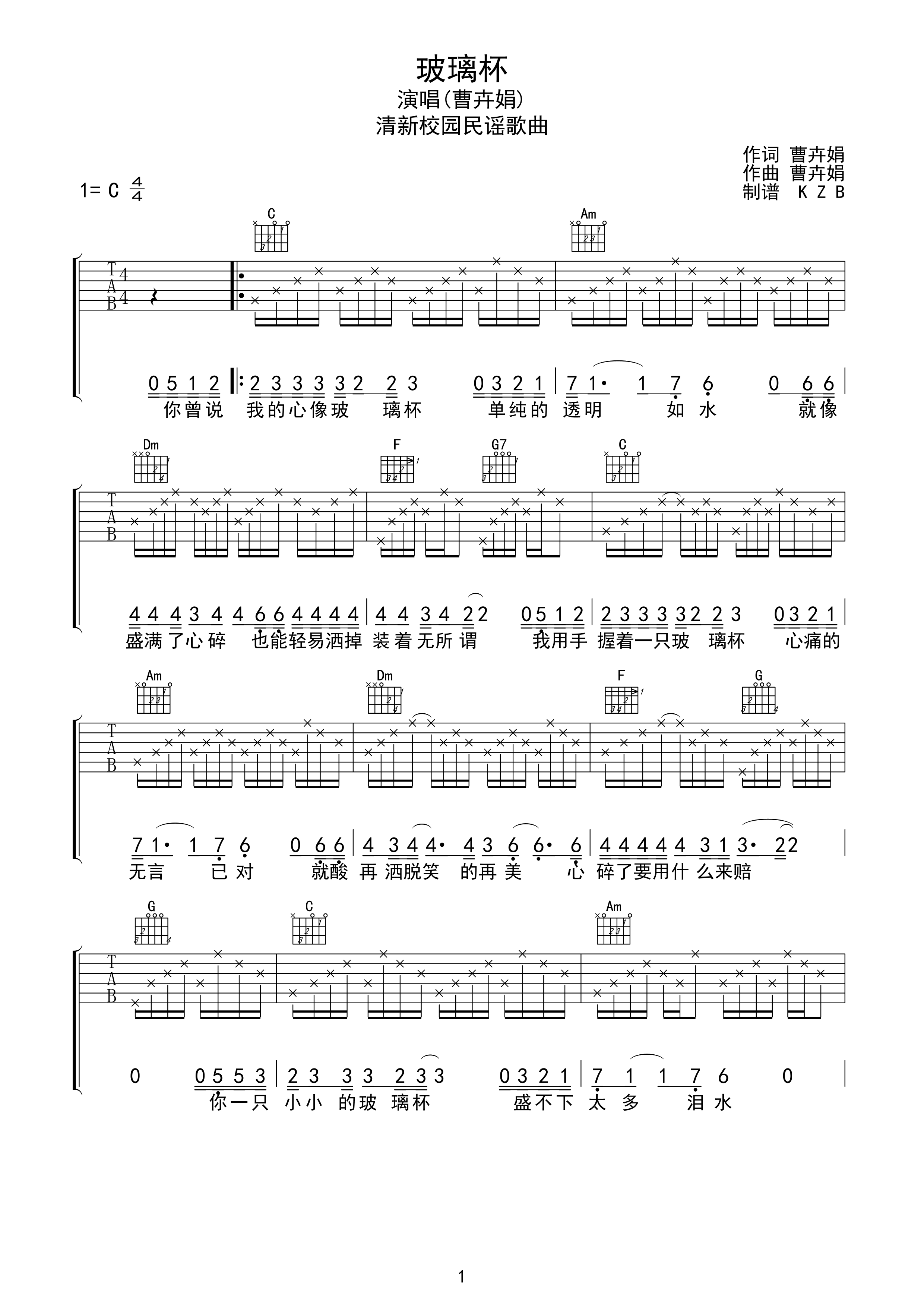 曲谱介绍: 曹卉娟《玻璃杯》吉他弹唱谱,采用C调指法编配,KZB编配出品,共有2张高清图谱,免翻页排版设计。