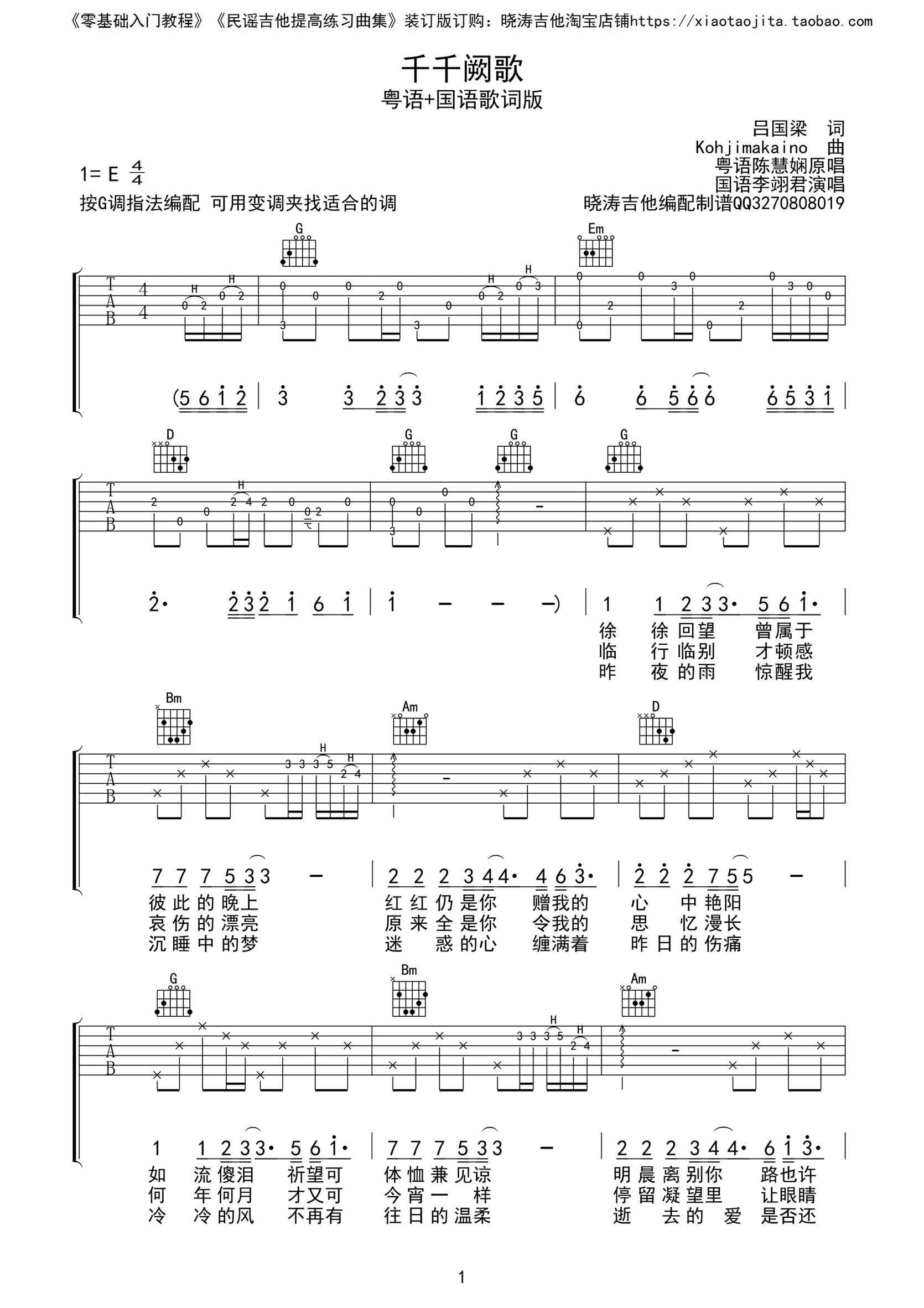 曲谱介绍: 陈慧娴《千千阙歌》吉他弹唱谱,采用G调指法编配,晓涛吉他编配出品,共有3张高清图谱。