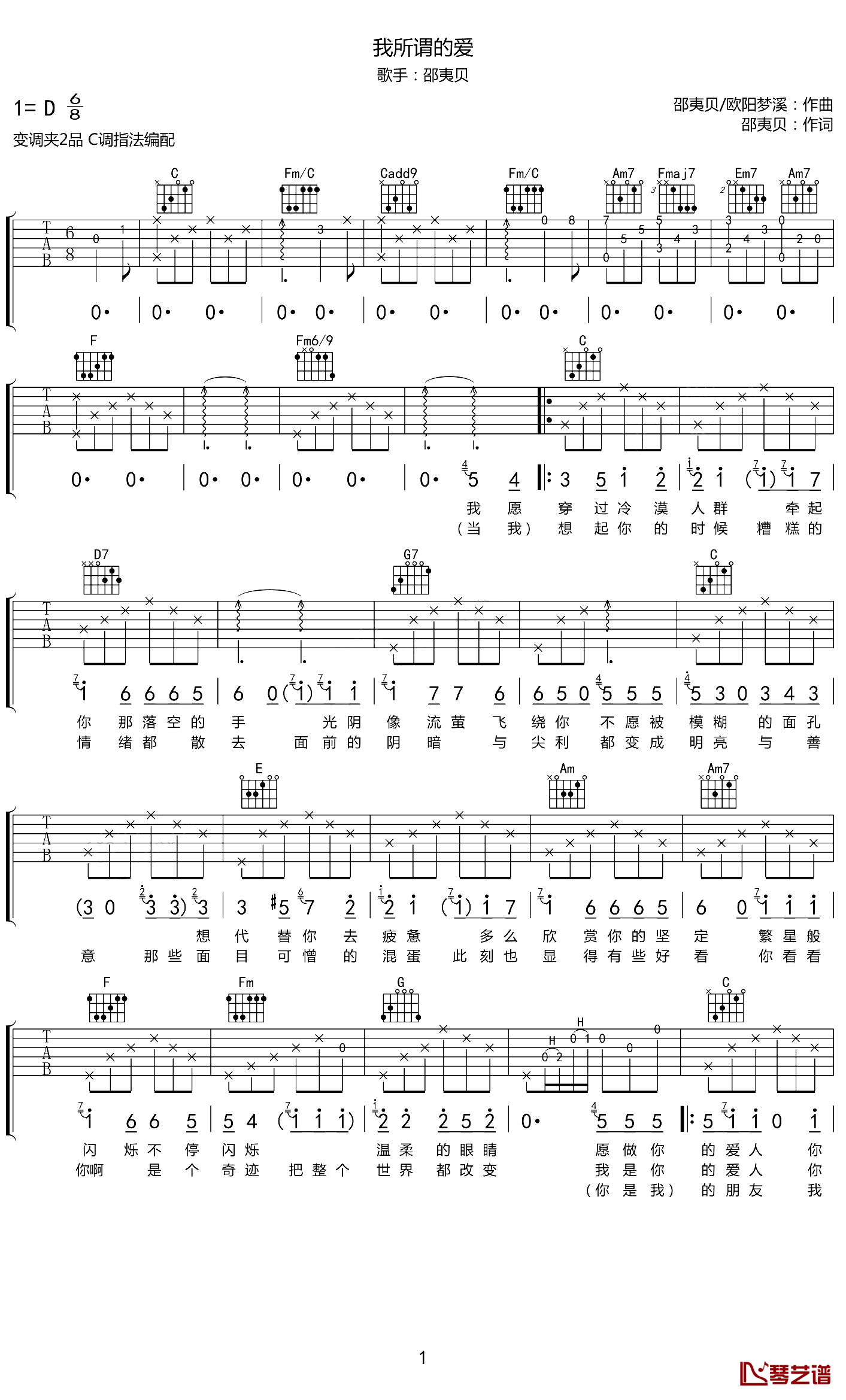 曲谱介绍: 邵夷贝《我所谓的爱》吉他弹唱谱,采用D调指法编配,琴艺谱编配出品,共有2张高清图谱,免翻页排版设计。