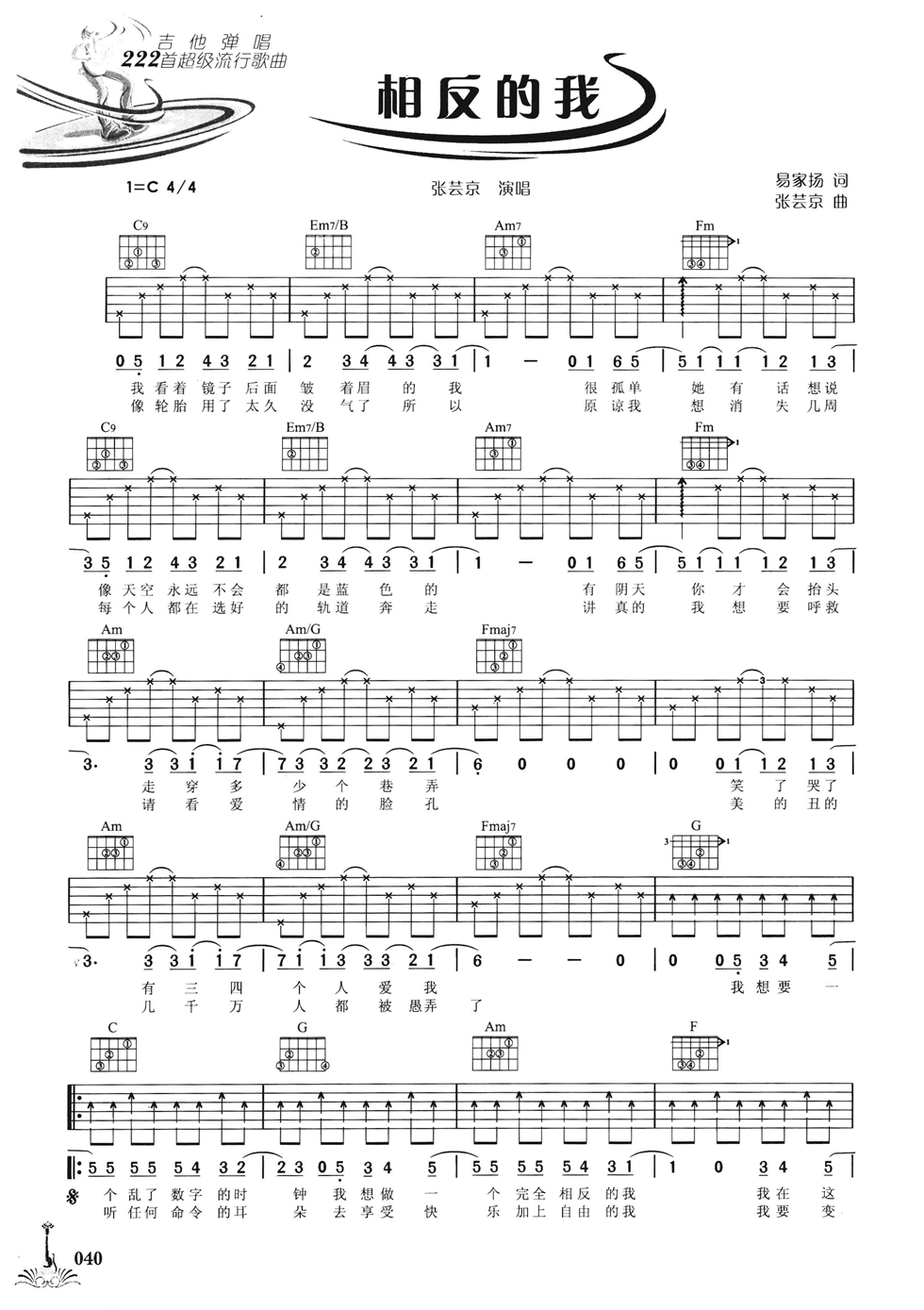 曲谱介绍: 张芸京《相反的我》吉他弹唱谱,采用C调指法编配,共有2张高清图谱,免翻页排版设计。