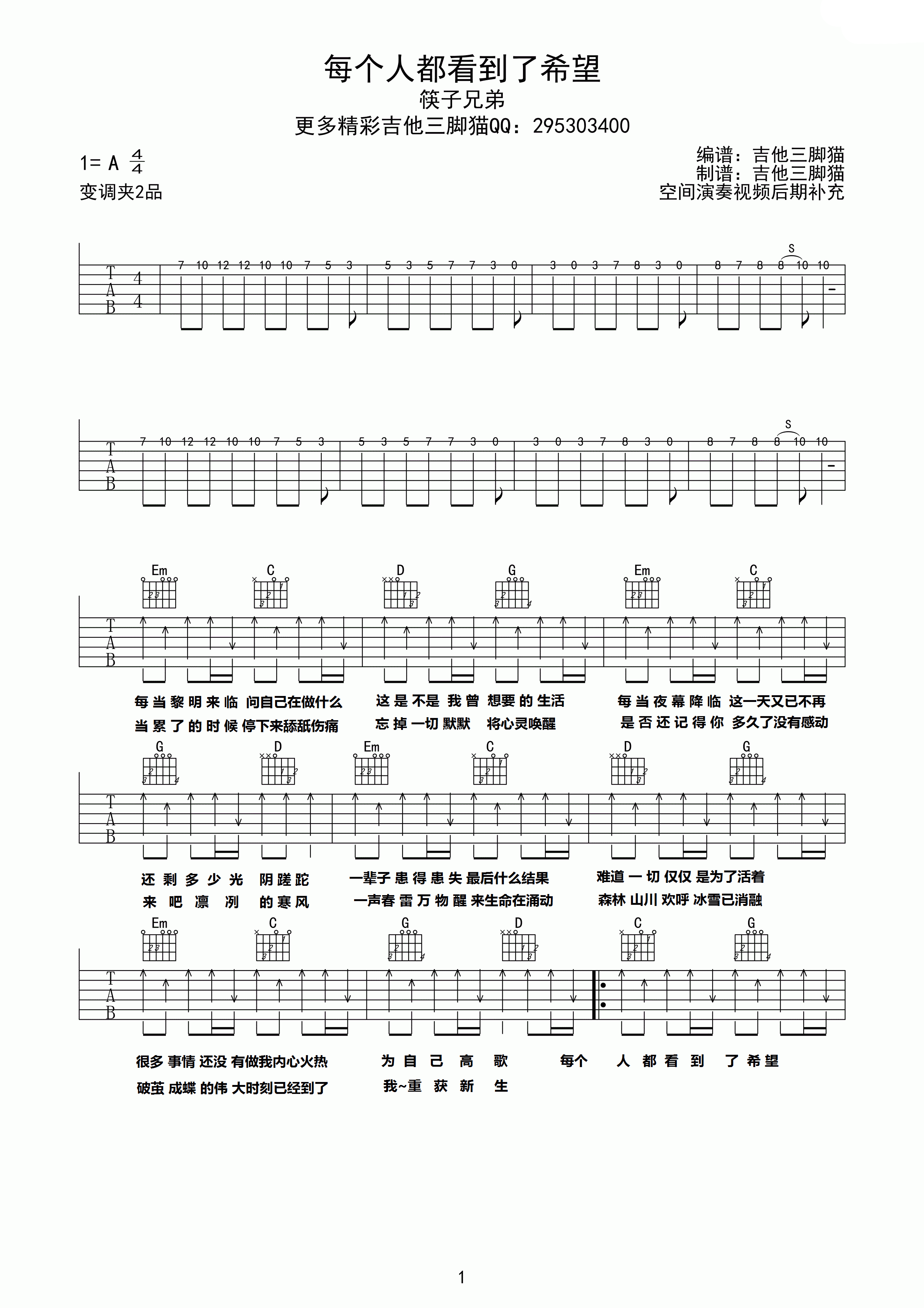 曲谱介绍: 筷子兄弟《每个人都看到了希望》吉他弹唱谱,采用A调指法编配,吉他三脚猫编配出品,共有2张高清图谱,免翻页排版设计。