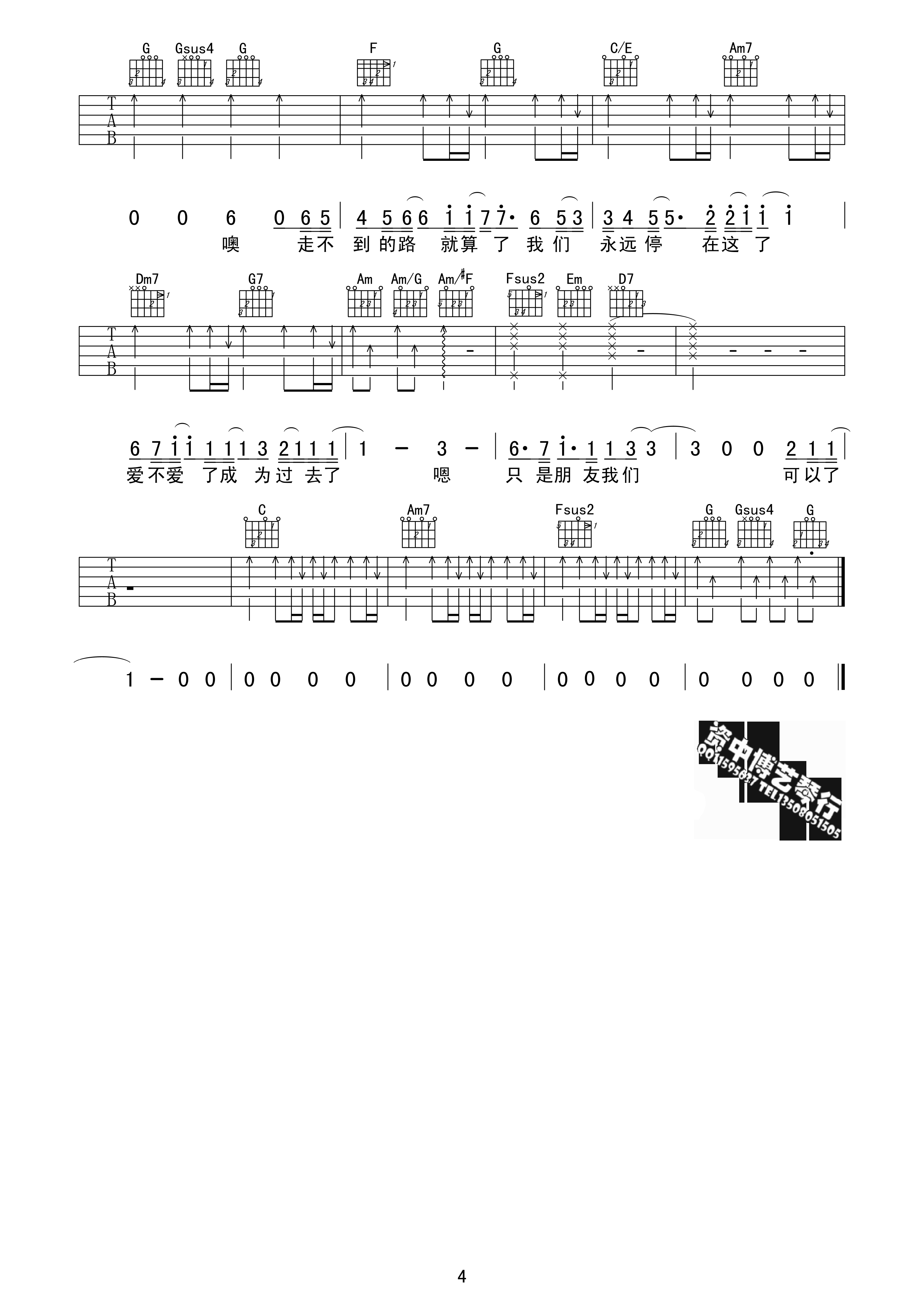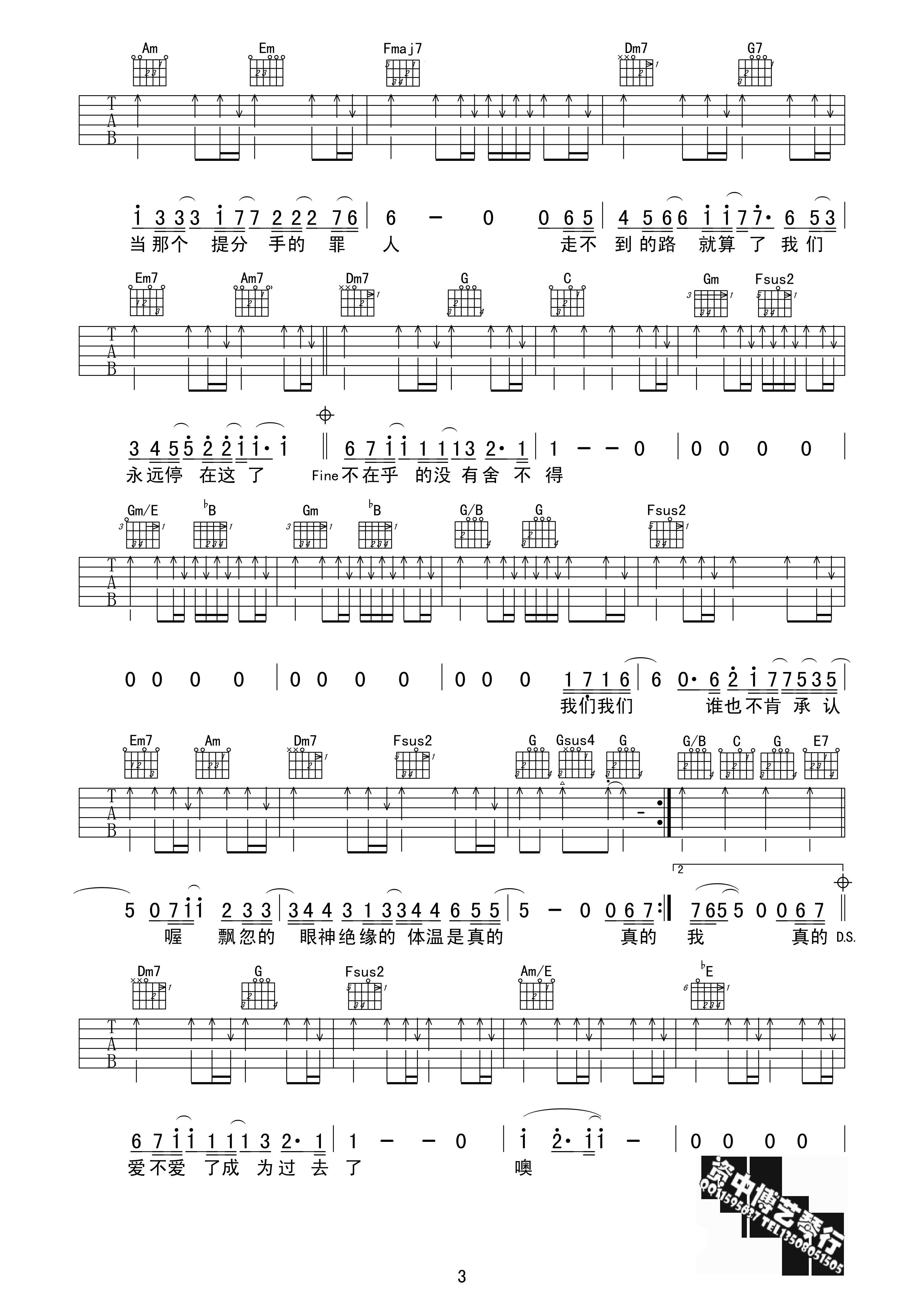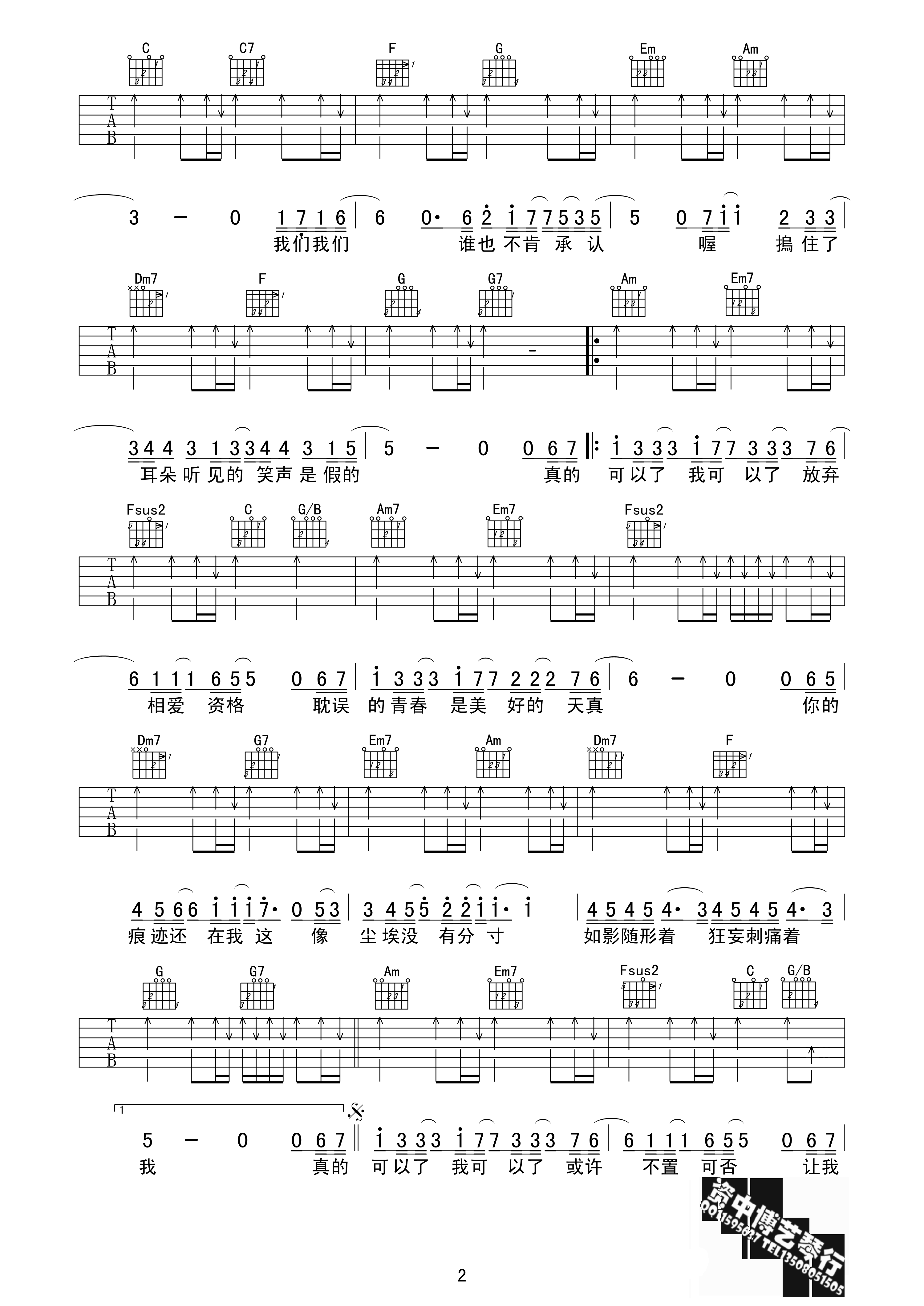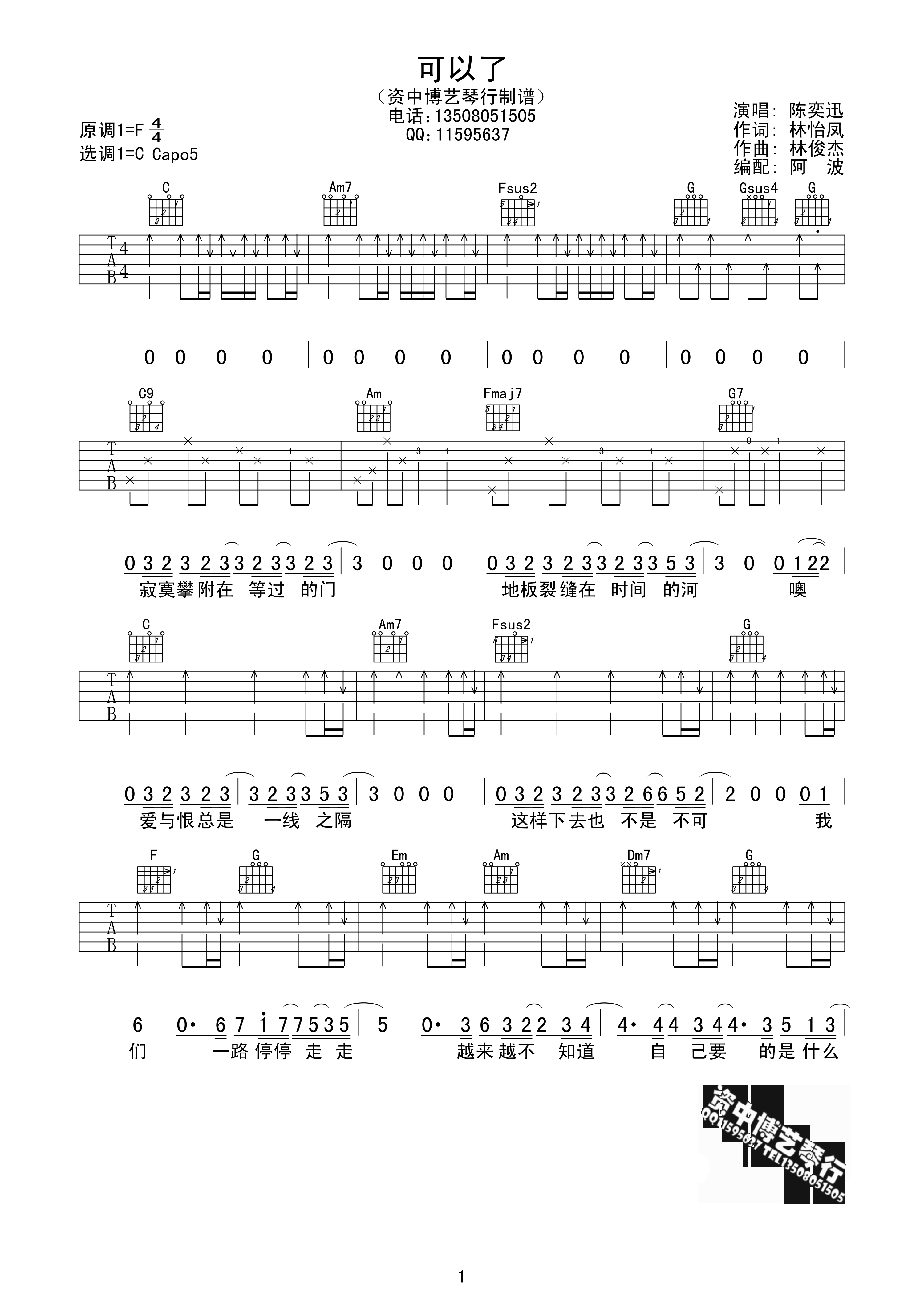 曲谱介绍: 陈奕迅《可以了》吉他弹唱谱,采用C调指法编配,资中博艺琴行编配出品,共有4张高清图谱。