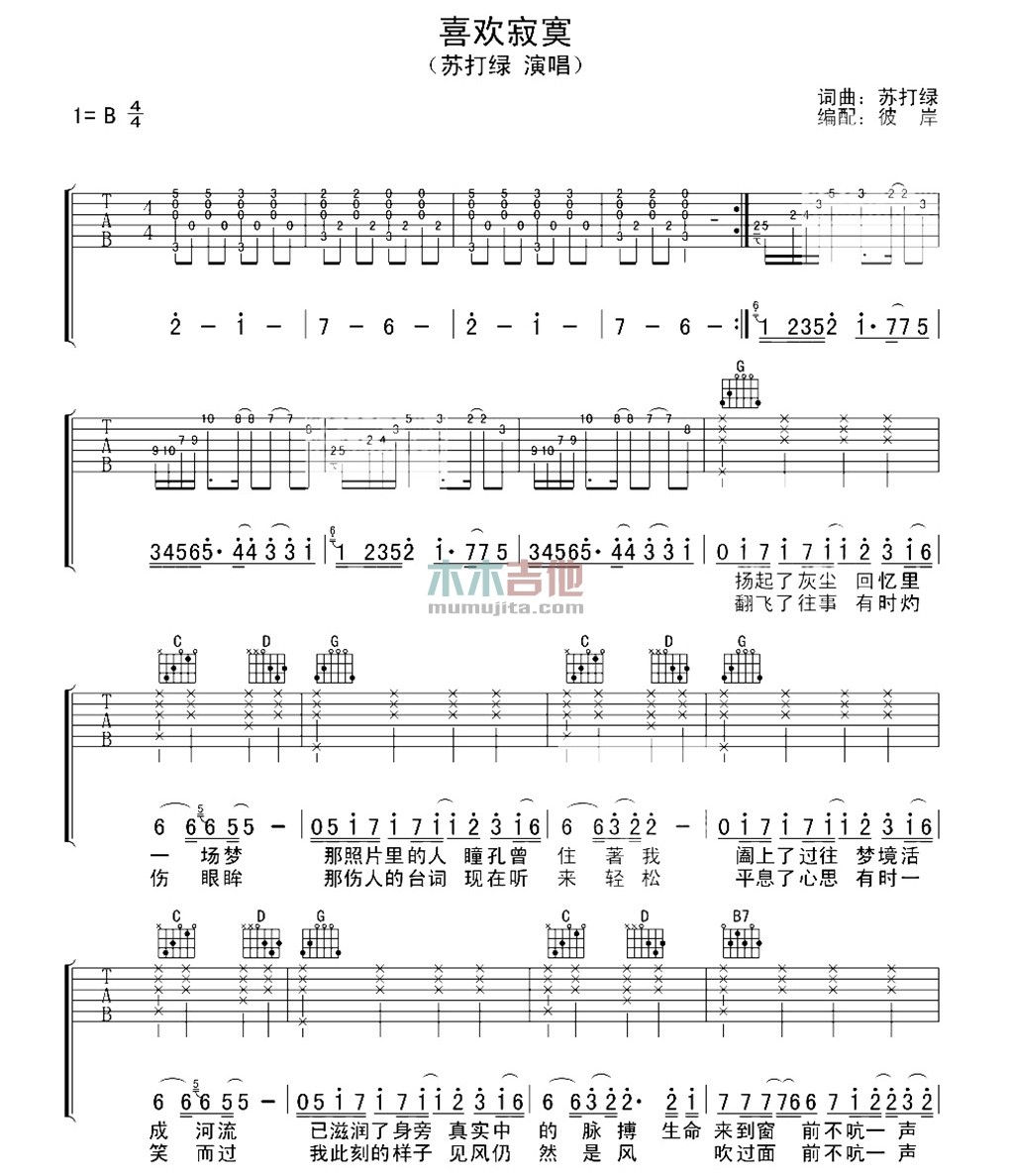 曲谱介绍: 苏打绿《喜欢寂寞》吉他弹唱谱,采用B调指法编配,木木吉他编配出品,共有2张高清图谱,免翻页排版设计。