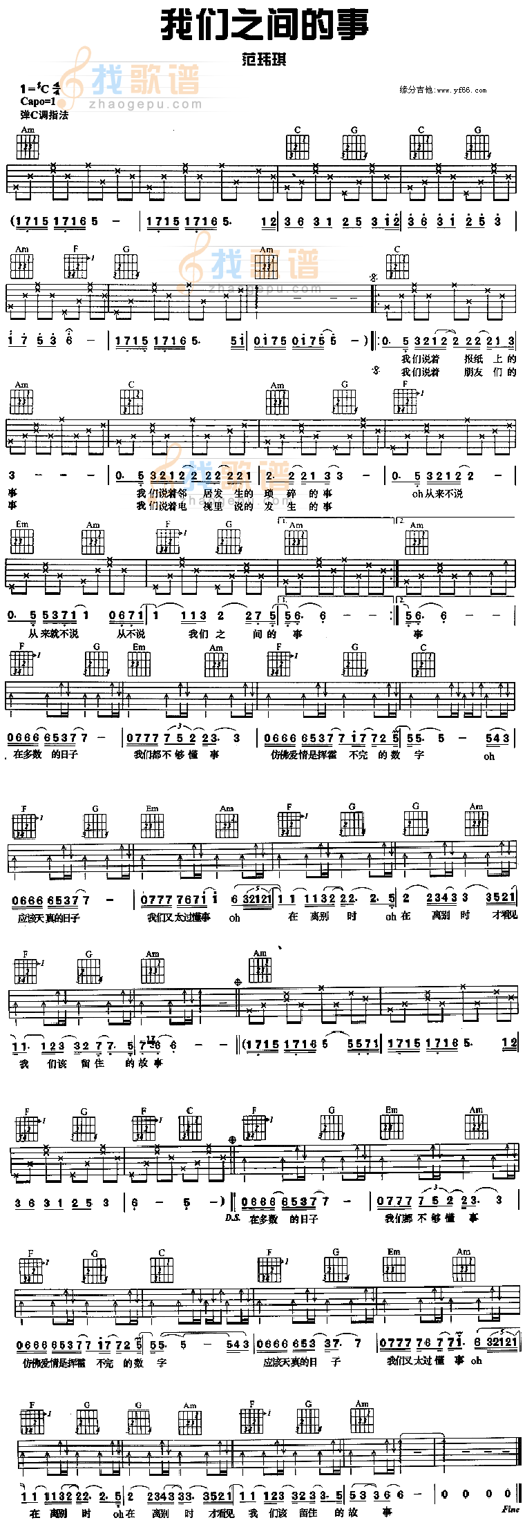 曲谱介绍: 范玮琪《我们之间的事》吉他弹唱谱,采用C调指法编配,共有1张高清图谱,免翻页排版设计。