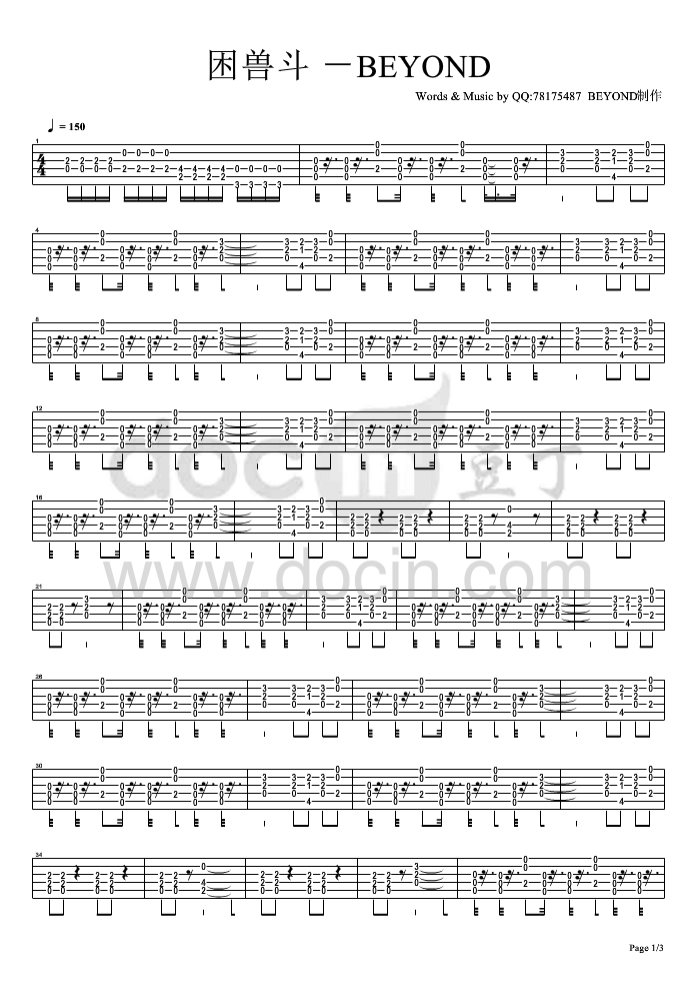 曲谱介绍: beyond《困兽斗》吉他独奏谱,豆丁网编配出品,共有3张高清图谱。
