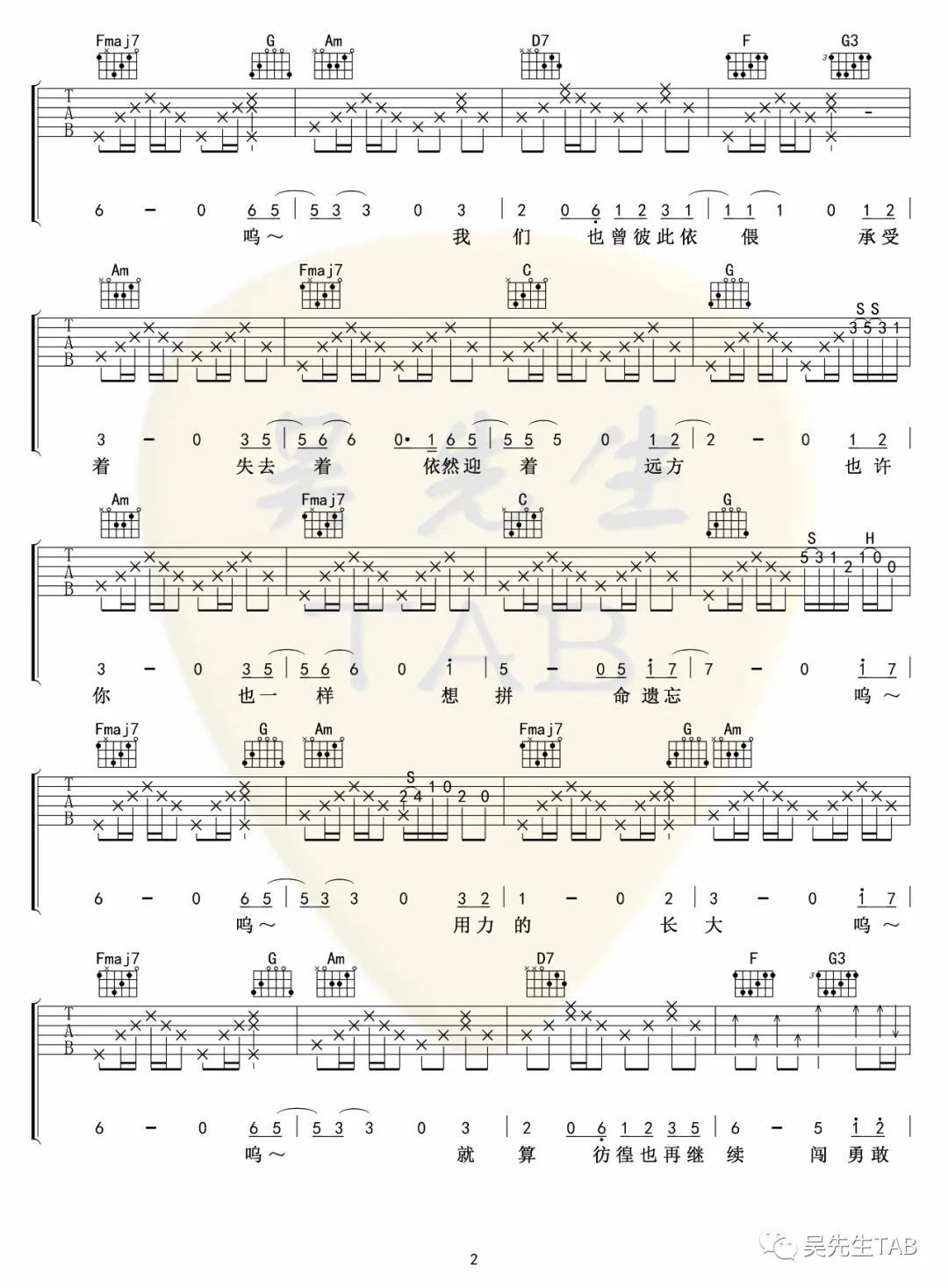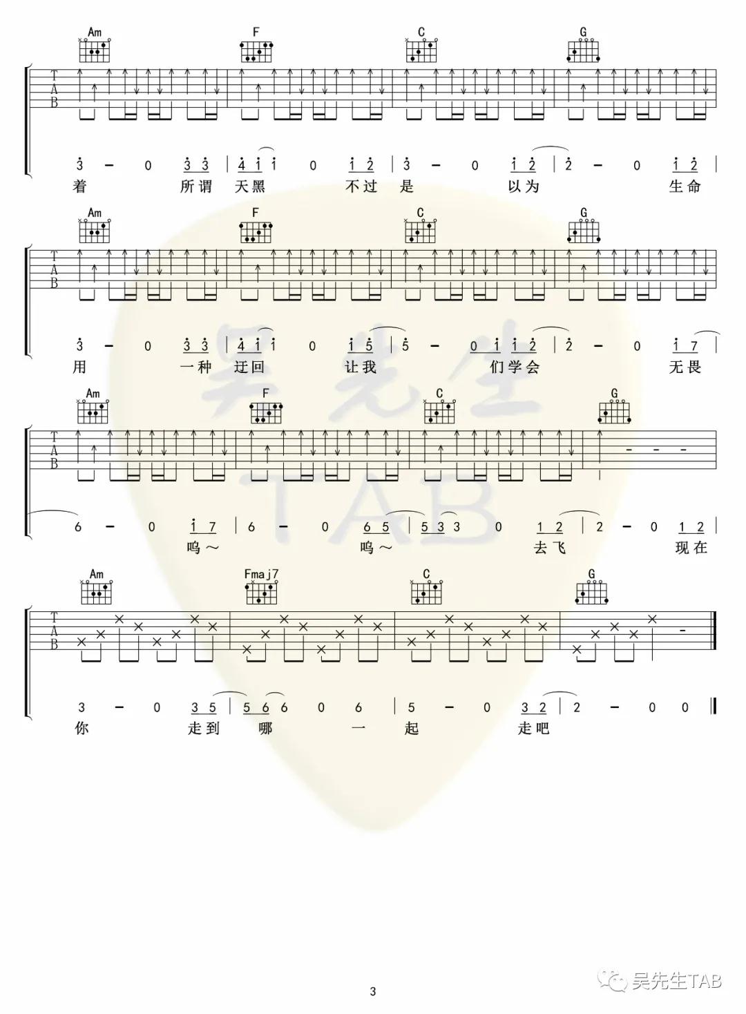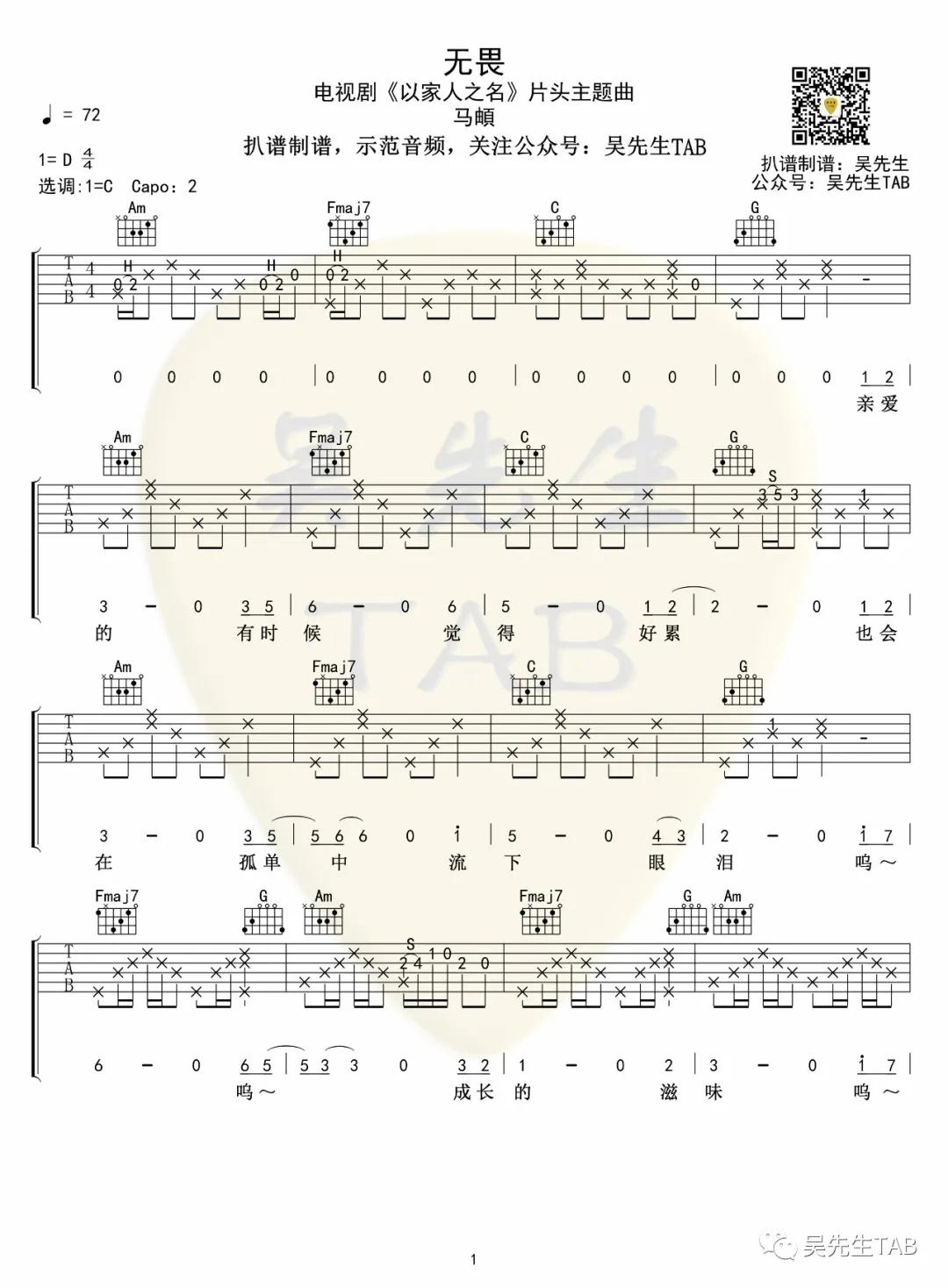 曲谱介绍: 马頔《无畏》吉他弹唱谱,采用C调指法编配,吴先生编配出品,共有3张高清图谱。