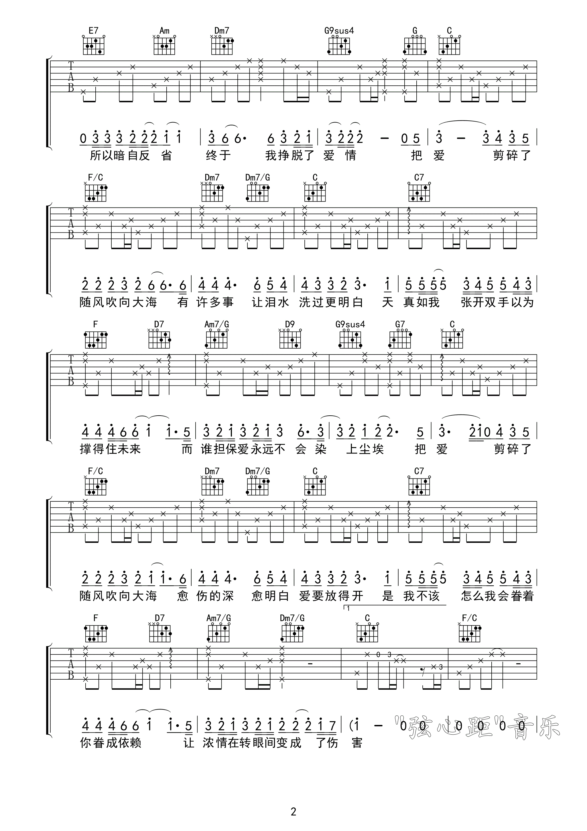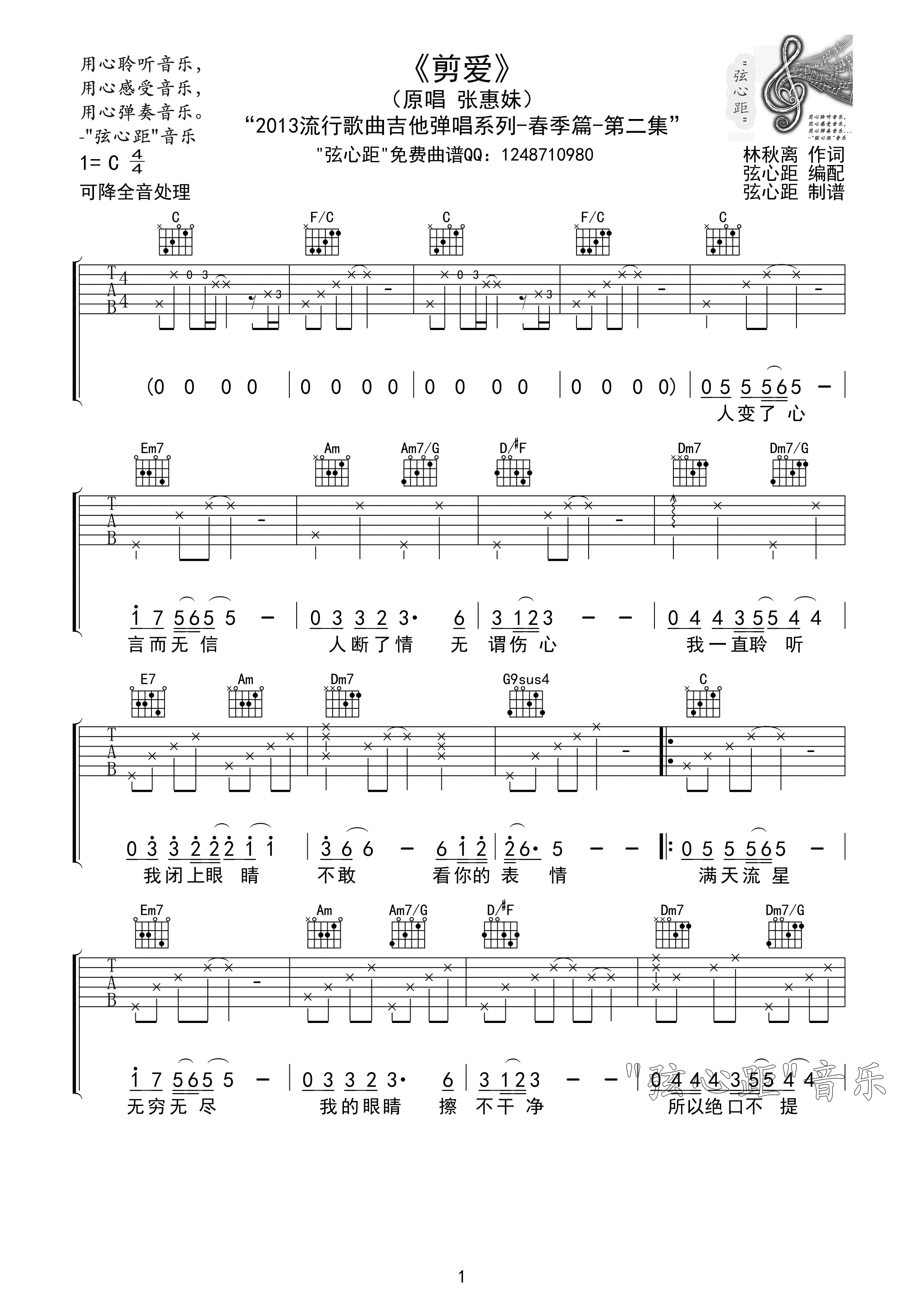 曲谱介绍: 张惠妹《剪爱》吉他弹唱谱,采用C调指法编配,弦心距编配出品,共有3张高清图谱。