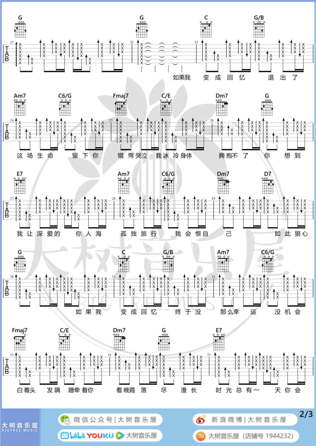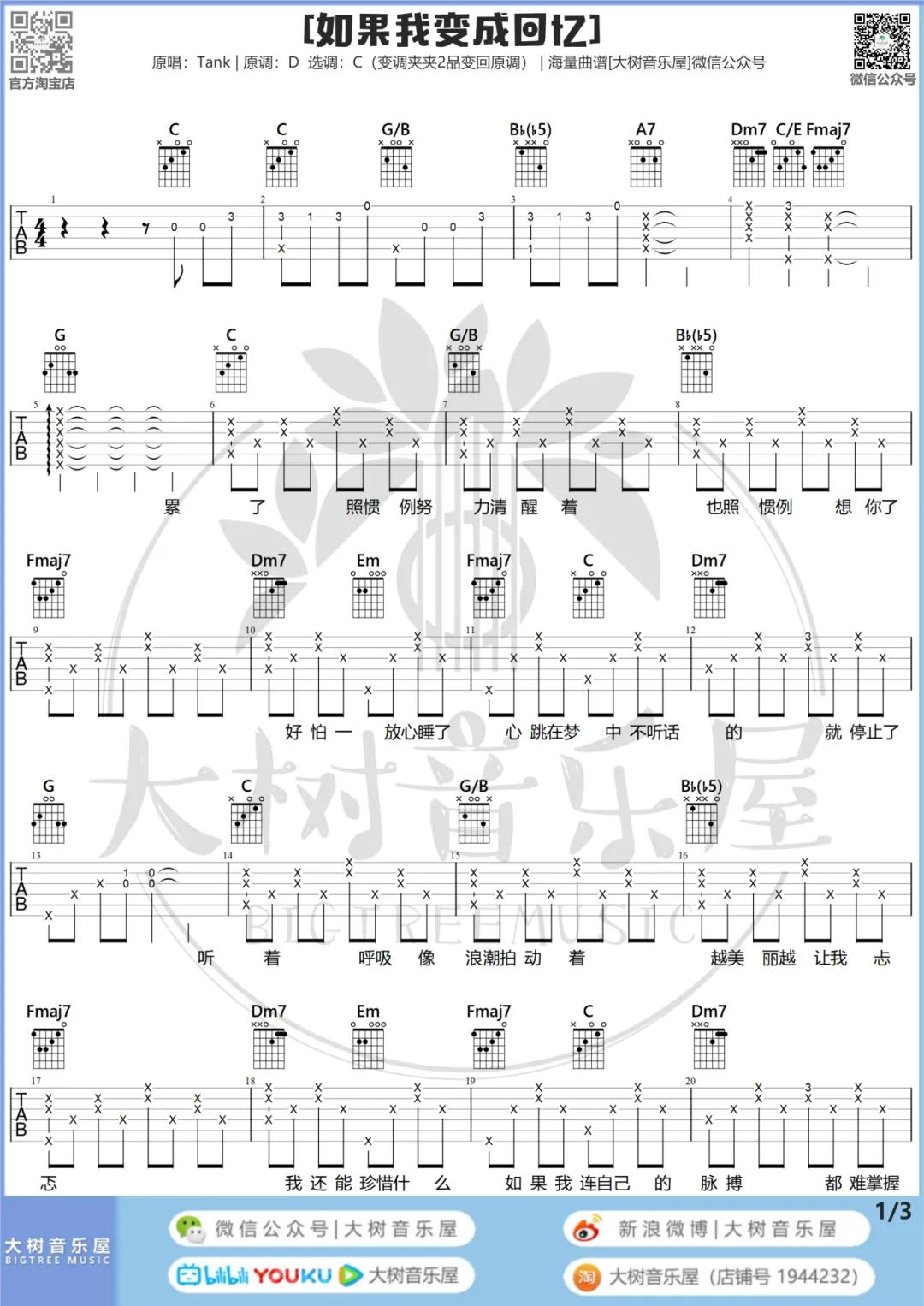 曲谱介绍: Tank《如果我变成回忆》吉他弹唱谱,采用C调指法编配,大树音乐屋编配出品,共有3张高清图谱。