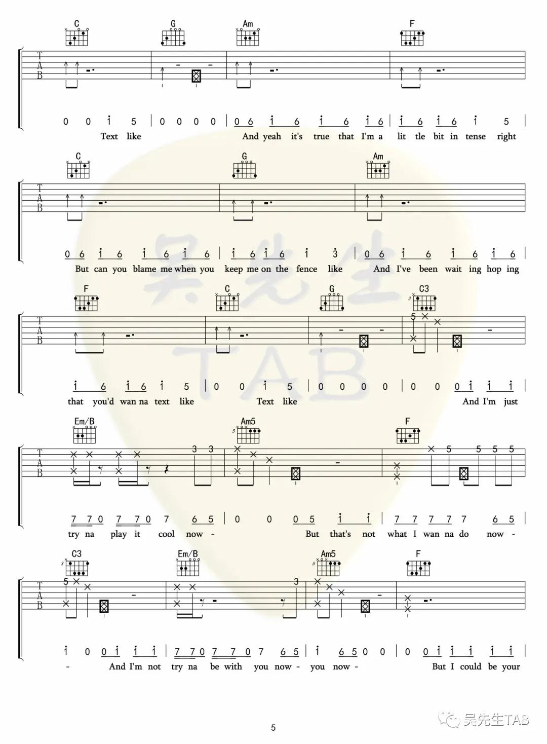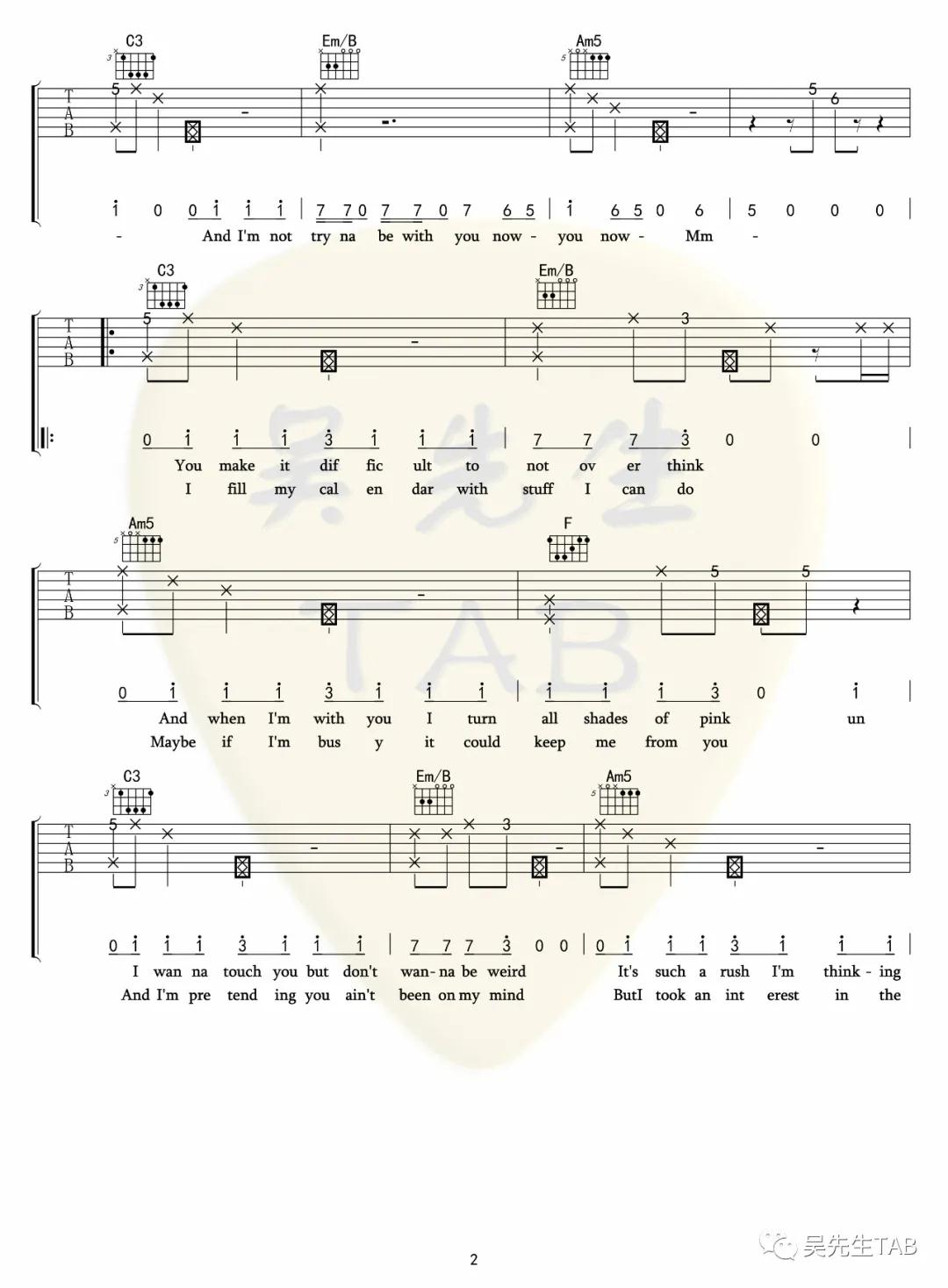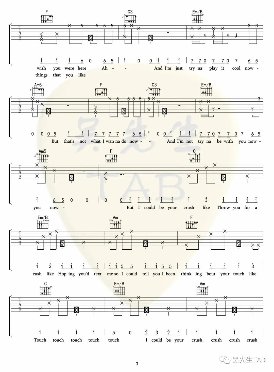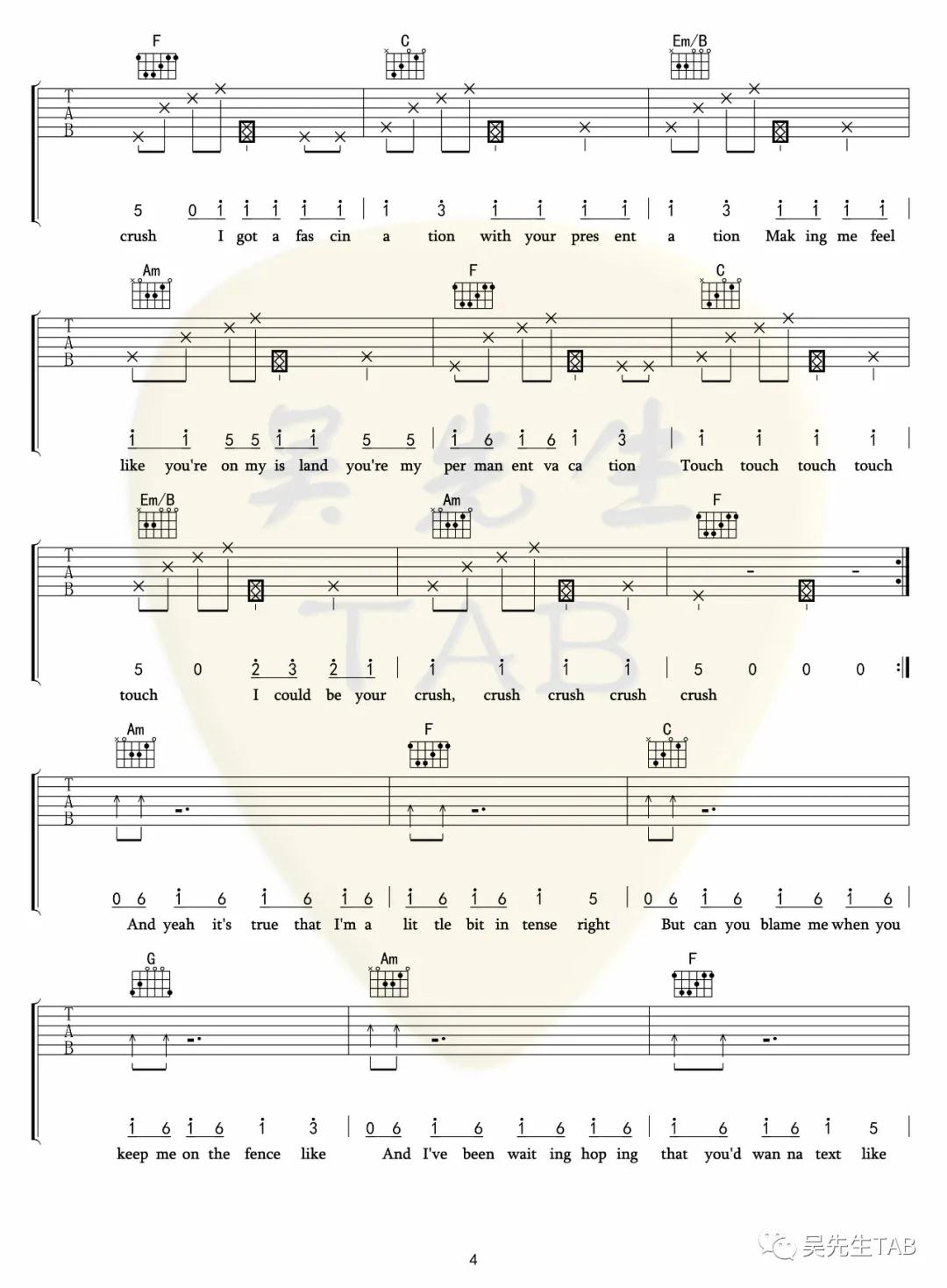 曲谱介绍: Tessa《Crush》吉他弹唱谱,采用C调指法编配,吴先生编配出品,共有6张高清图谱。