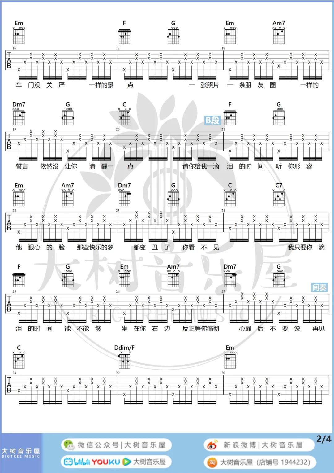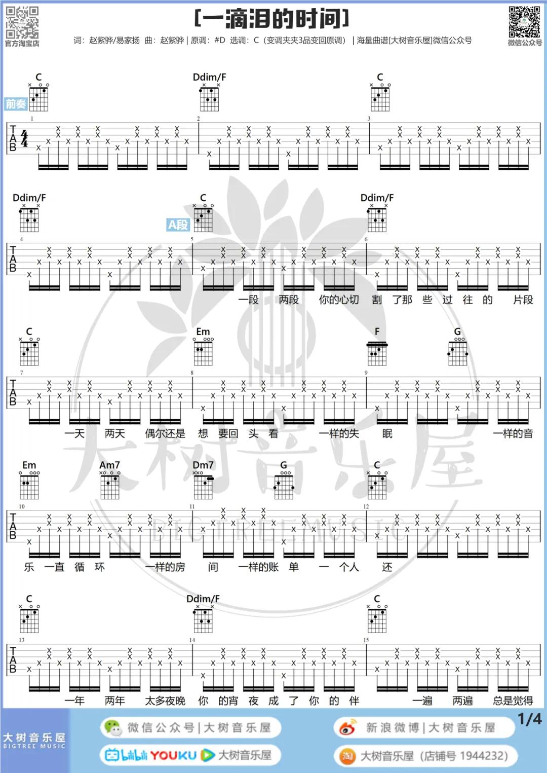 曲谱介绍: 赵紫骅《一滴泪的时间》吉他弹唱谱,采用C调指法编配,大树音乐屋编配出品,共有5张高清图谱。