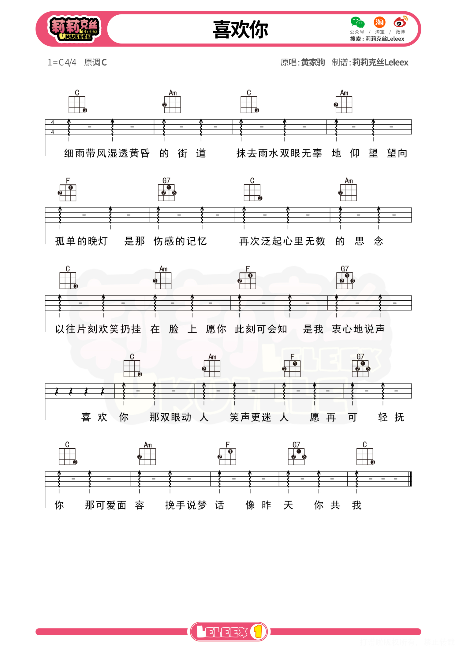 曲谱介绍: 「喜欢你」尤克里里曲谱 更多尤克里里曲谱/教学  关注@莉莉克丝Leleex