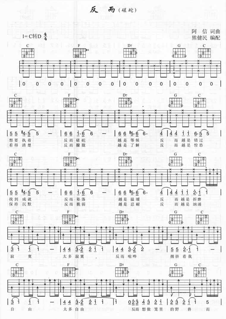 曲谱介绍: 五月天《反而》吉他弹唱谱,采用C调指法编配,熊健民编配出品,共有3张高清图谱。