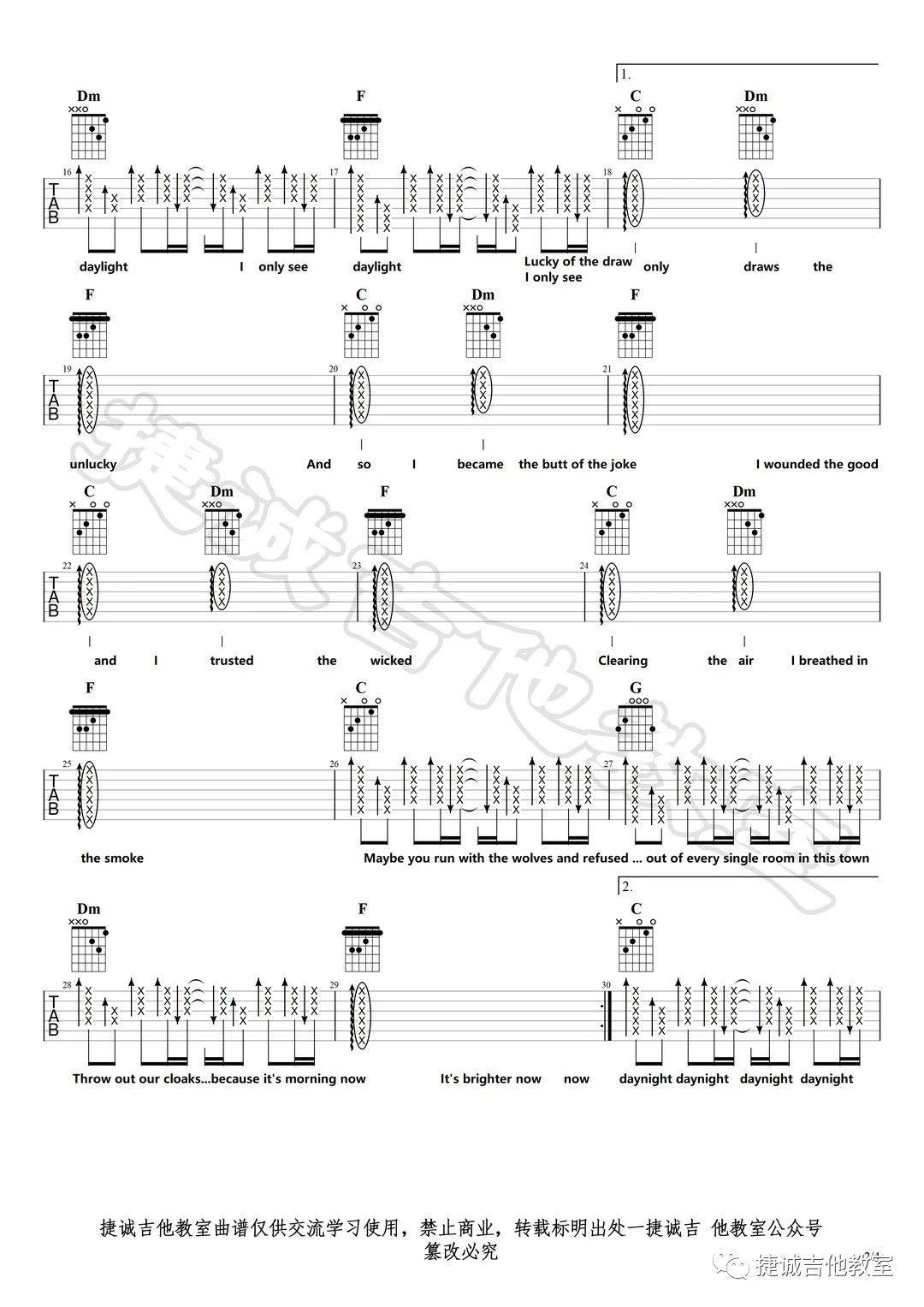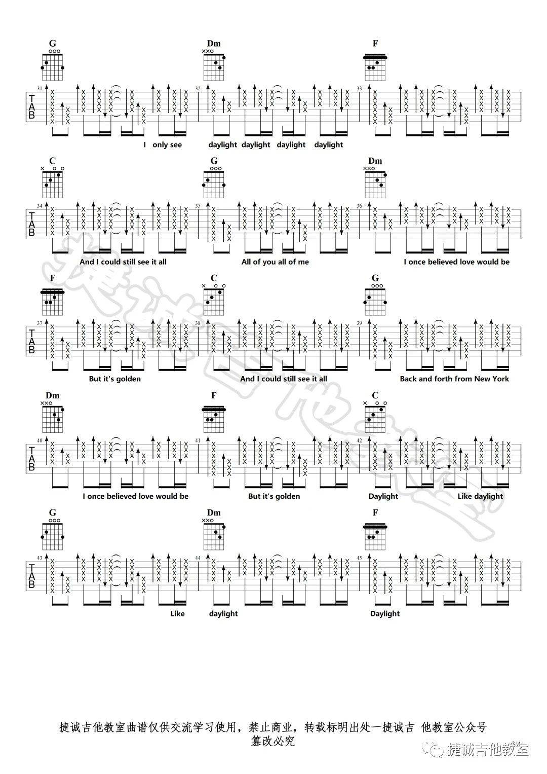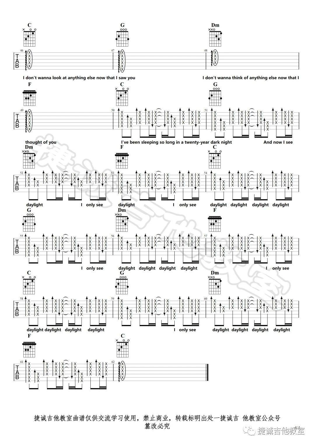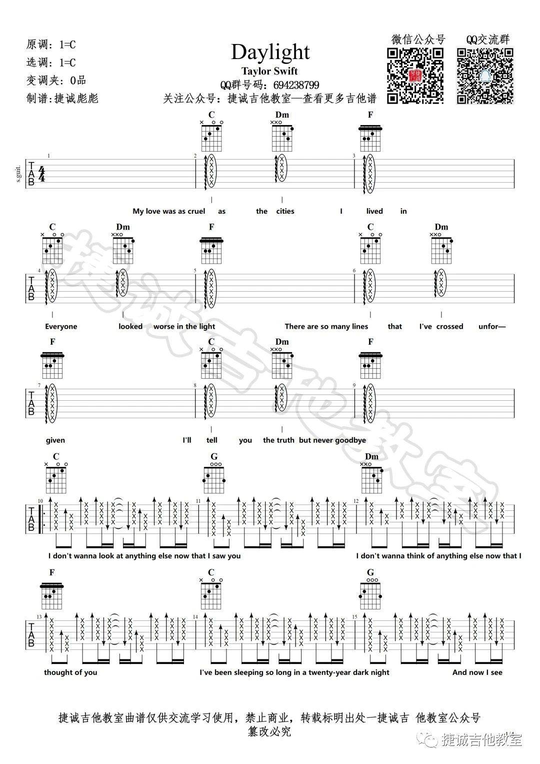 曲谱介绍: taylor《Daylight》吉他弹唱谱,采用C调指法编配,捷诚吉他教室编配出品,共有4张高清图谱。