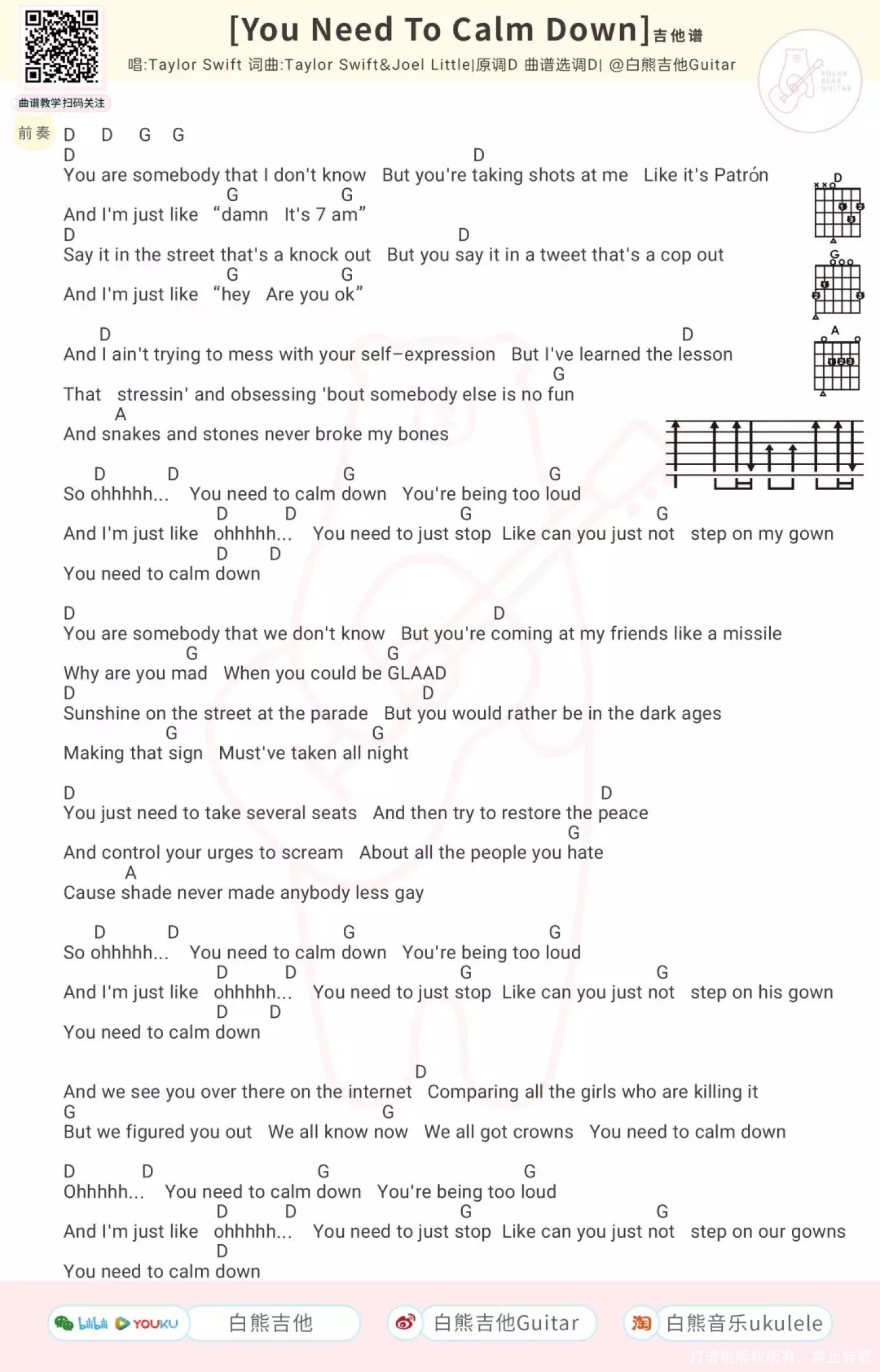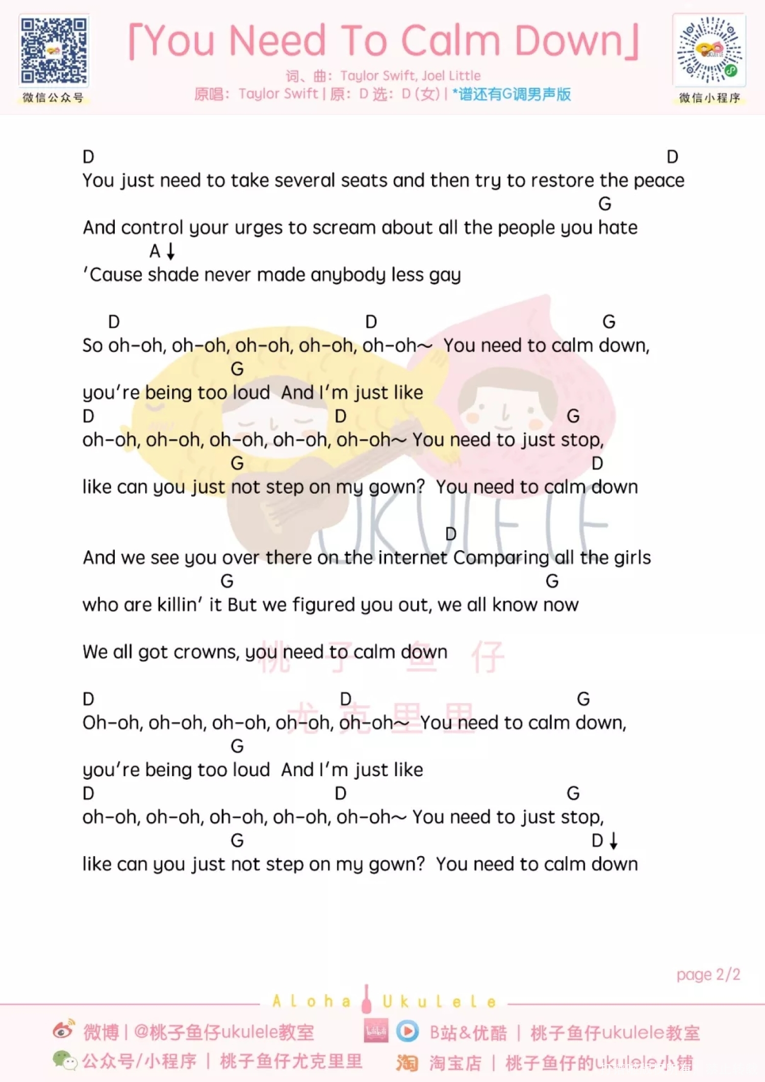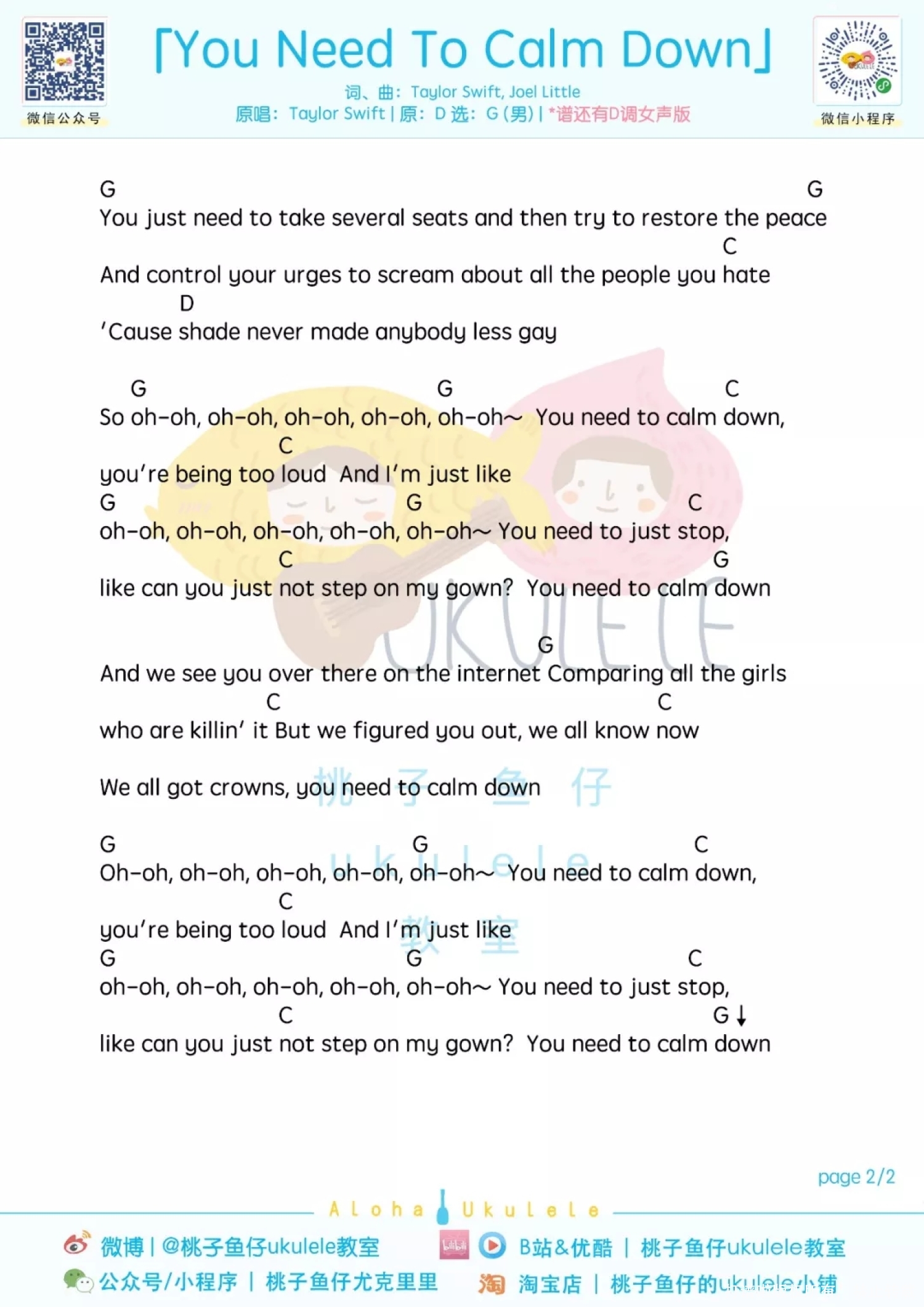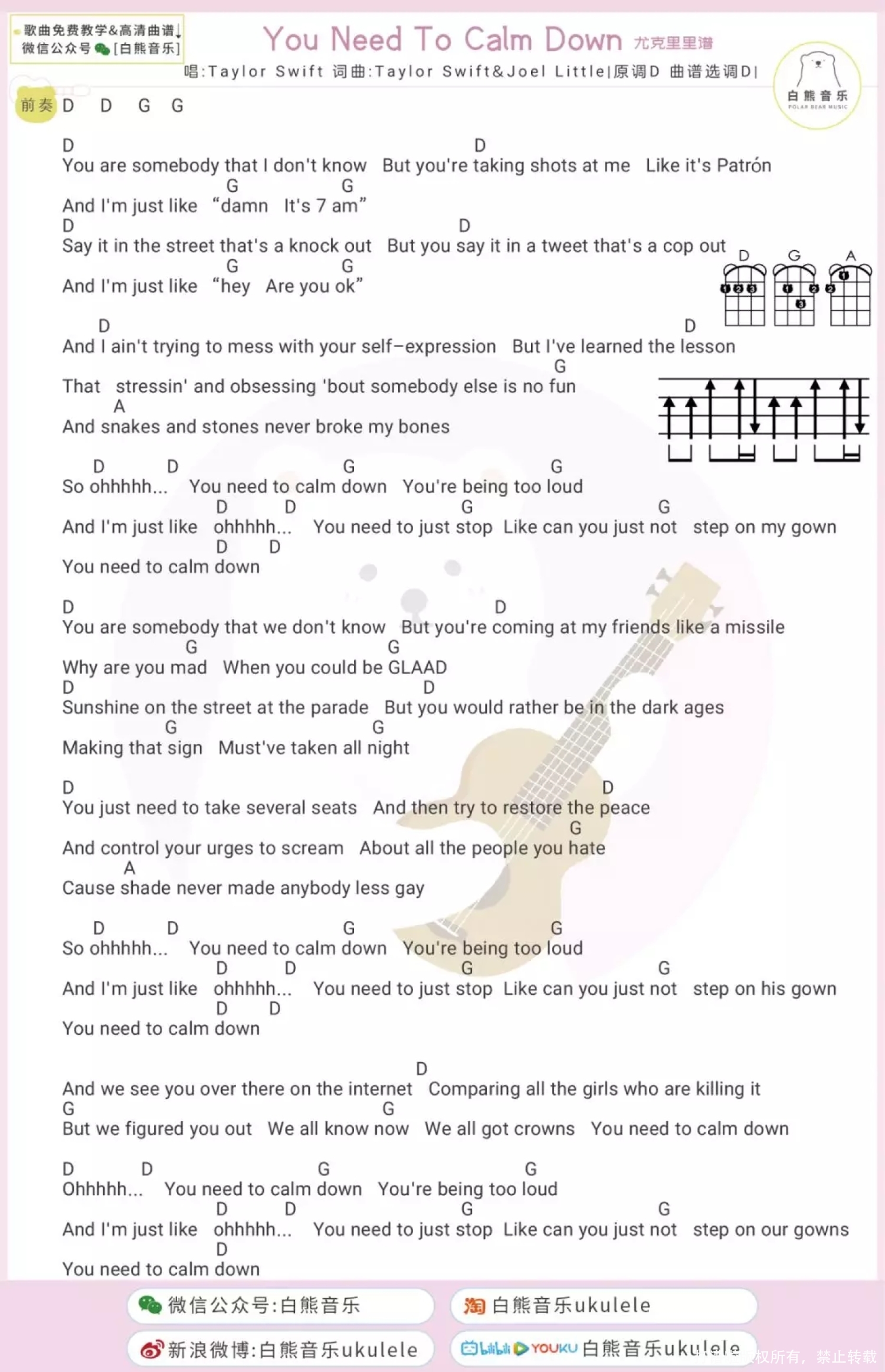 曲谱介绍: 霉霉又出新单啦!! 你循环得怎么样了啊? MV看了吗 ? 这一次,霉霉在新歌中diss了那些“张口就来”的口水键盘侠,抨击他们过于聒噪,需要冷静一下。   You Need To Calm Down音乐MV:霉果大和解~   You Need To Calm Down ukulele谱 1、女声版 D调   2、男声版G调   3、白熊D调版   4、You Need To Calm Down吉他谱