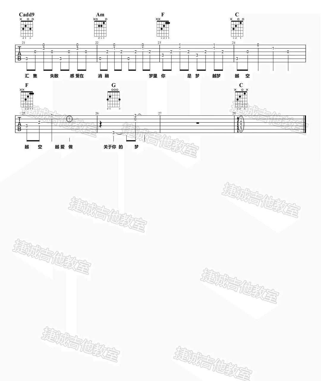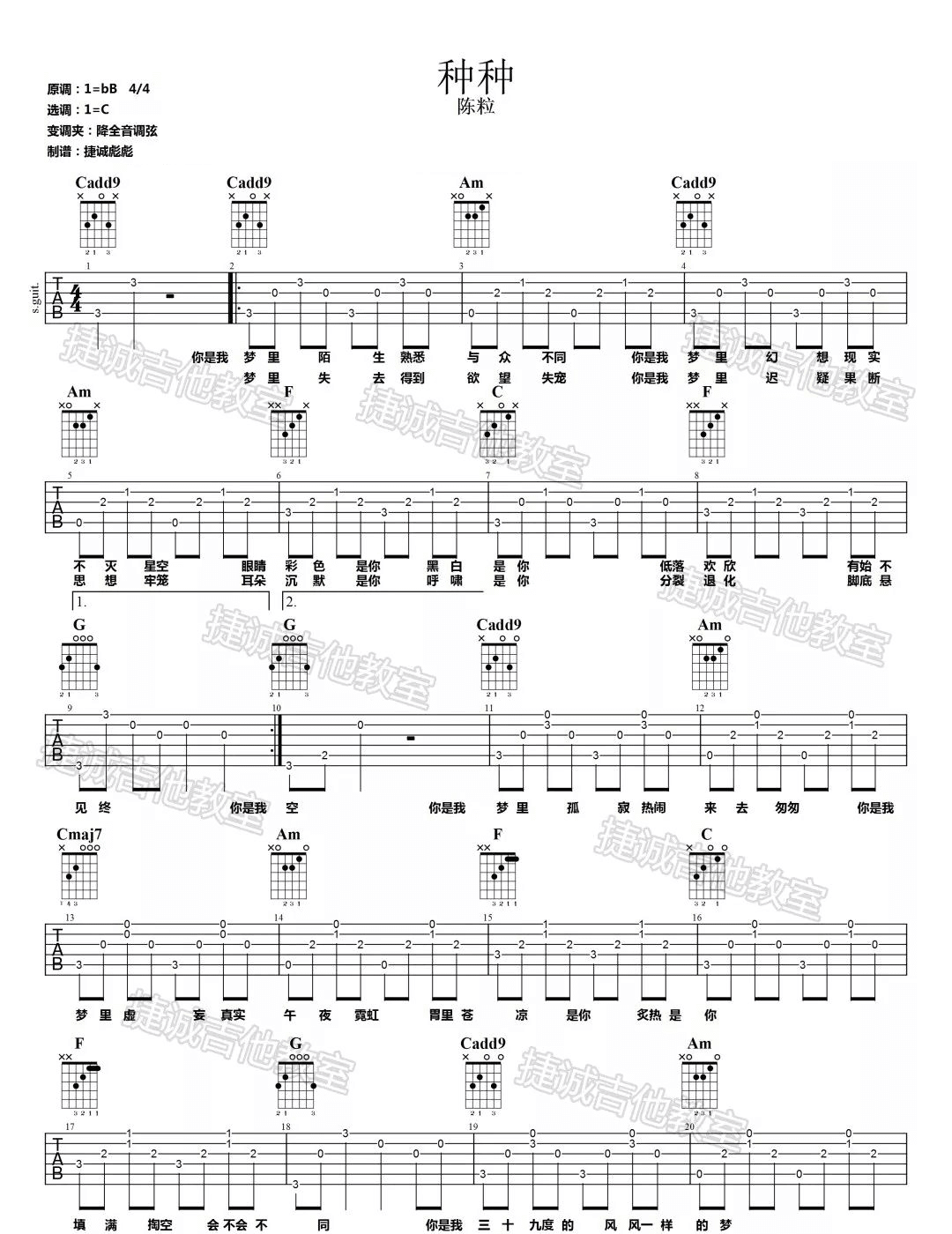 曲谱介绍: 此版本的曲谱来源于捷诚吉他教室扒谱制谱,歌曲原调为降B调,这里采用C调指法进行编配,演唱时降全音调弦即可回到原调,不过降全音的话,琴弦就比较松软特别是低音弦,所以大家看情况而定需不需要降音。 种种吉他谱_陈粒_《种种》C调简单版弹唱六线谱_高清图片谱: