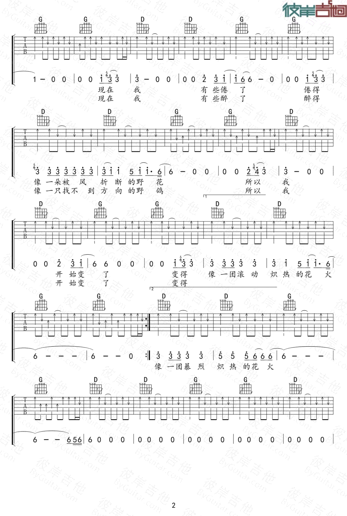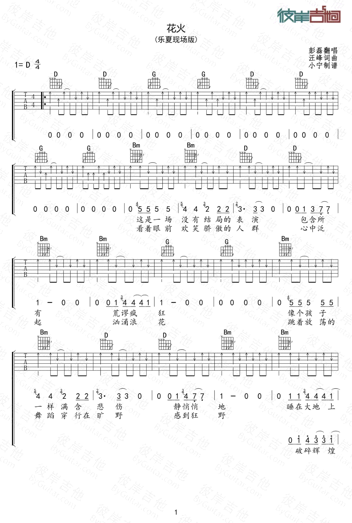 曲谱介绍: 新裤子乐队《花火》吉他弹唱谱,采用D调指法编配,彼岸吉他编配出品,共有3张高清图谱。