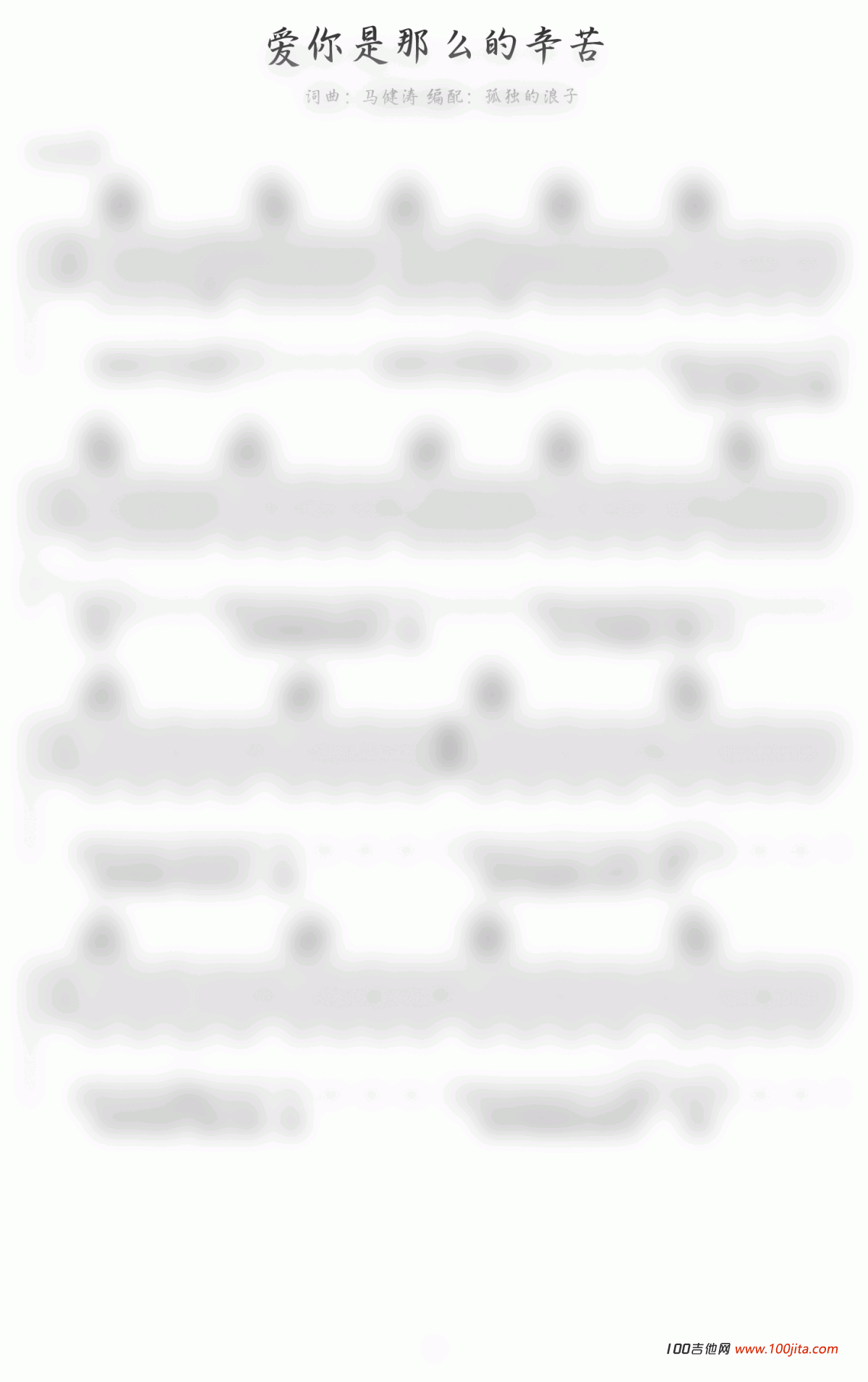 曲谱介绍: 《爱你是那么的辛苦》吉他谱是根据歌手马健涛的一首歌编配的六线谱。吉他谱采用C调和弦编配,非常好听的一首歌曲。网友孤独的浪子编配,100吉他代发布。喜欢的朋友可以看看付费版哦