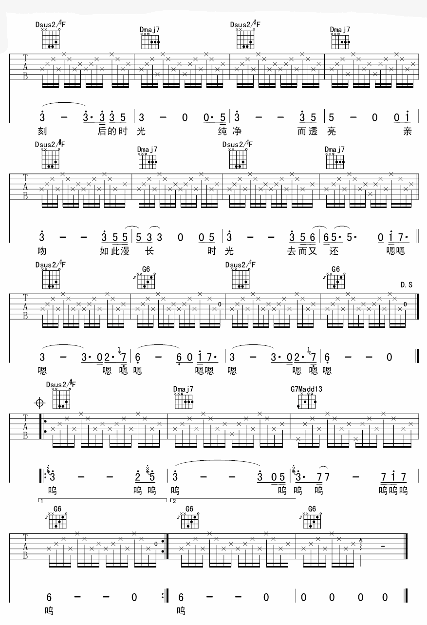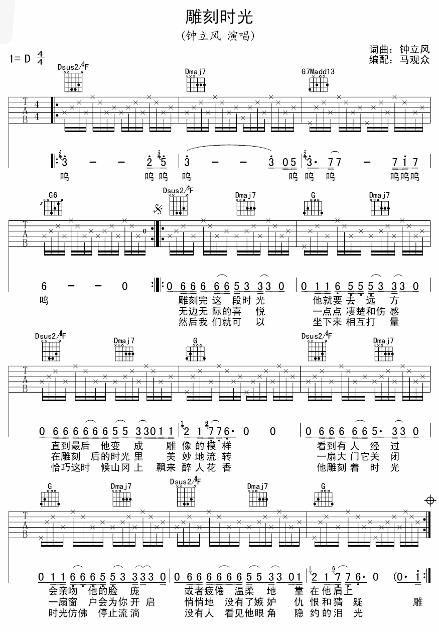 曲谱介绍: 钟立风《雕刻时光》吉他弹唱谱,采用D调指法编配,马观众编配出品,共有2张高清图谱,免翻页排版设计。