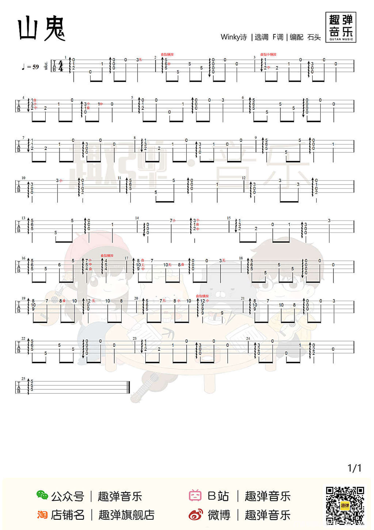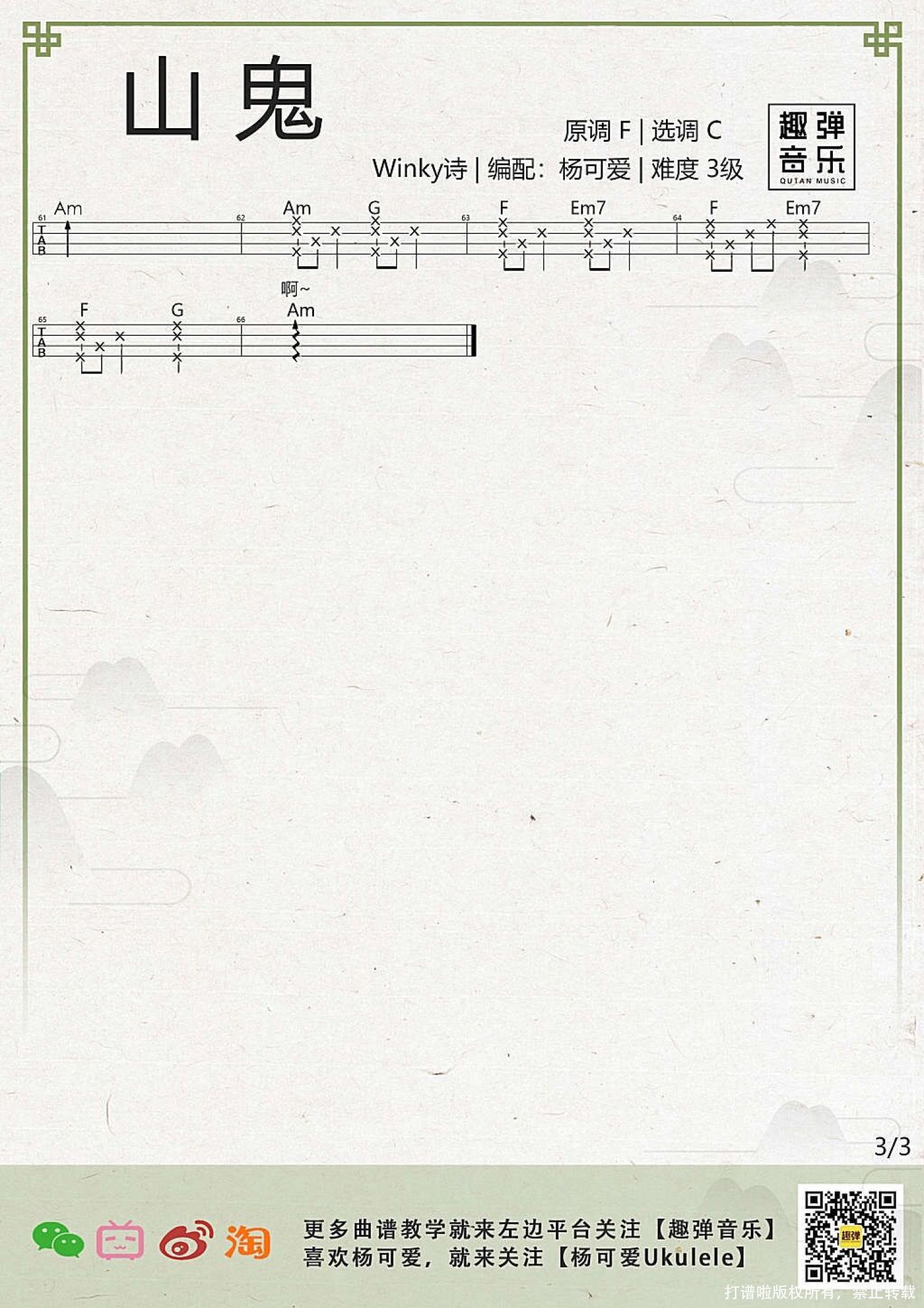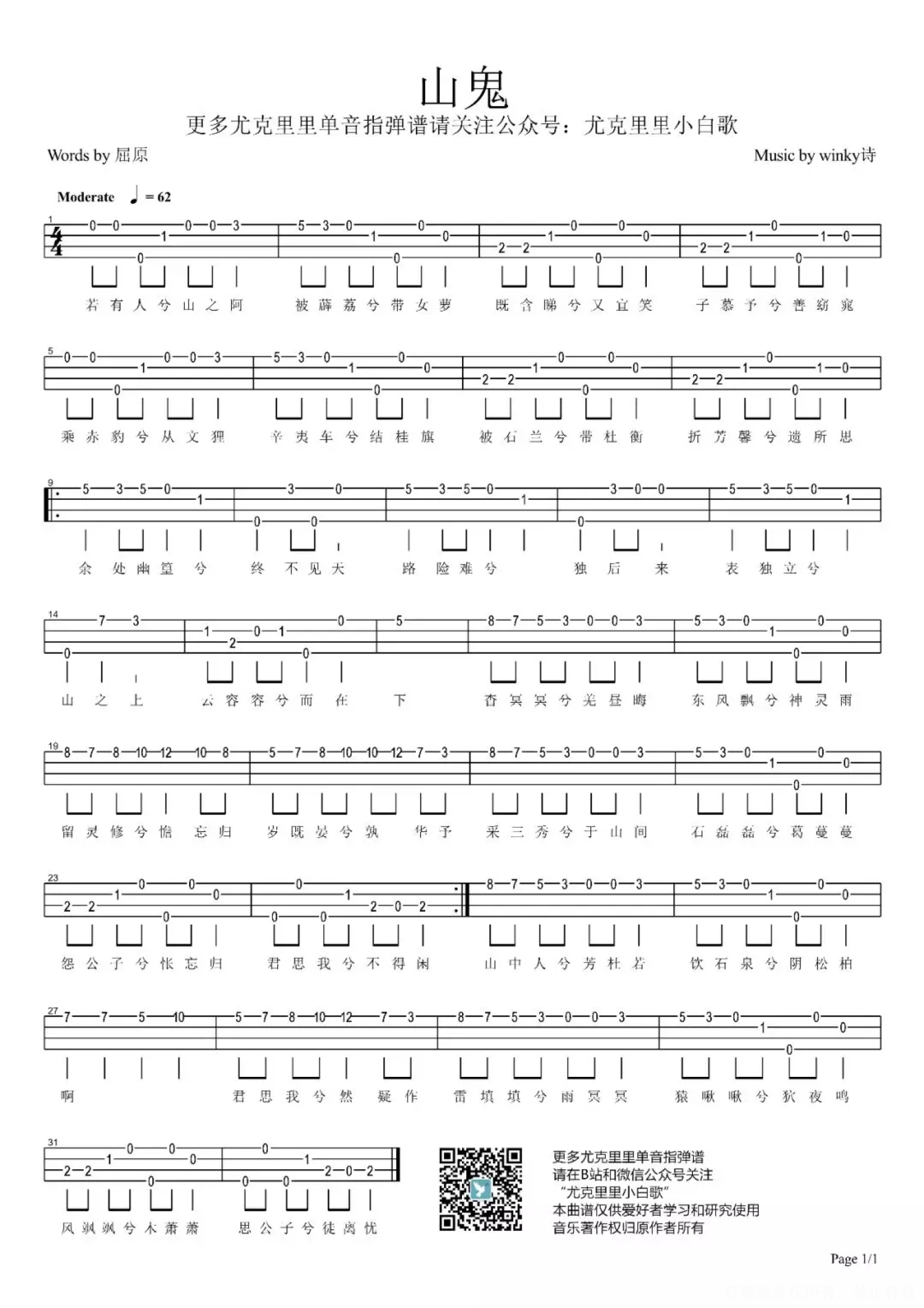 曲谱介绍: 山鬼指弹丰富版 目录 Aloha~ 今天要教大家一首古风歌曲 是winky诗演唱的「山鬼」 歌曲的歌词都选自于 屈原的诗词「九歌·山鬼」 用尤克里里弹奏这首歌 是不是也算屈原大大合作了呢~   山鬼指弹丰富版 山鬼指弹演示   大白老师有话说: Aloha大家好!我是新加入到趣弹family滴大白老师,初次跟大家见面,希望这次的教学能够帮助大家学会这首歌,以后我也会努力给大家带来更多好听又好学的指弹! 在这一次教学的筹备中,非常感谢能得到uncle周以及导演的帮助,视频最后才能成功产出。这也是我第一次通过录制视频的方式来讲课,有什么不足之处,希望大家能给我多提建议~   山鬼指弹教学   山鬼尤克里里指弹谱(丰富版)   山鬼指弹谱(单音版)   山鬼尤克里里弹唱谱