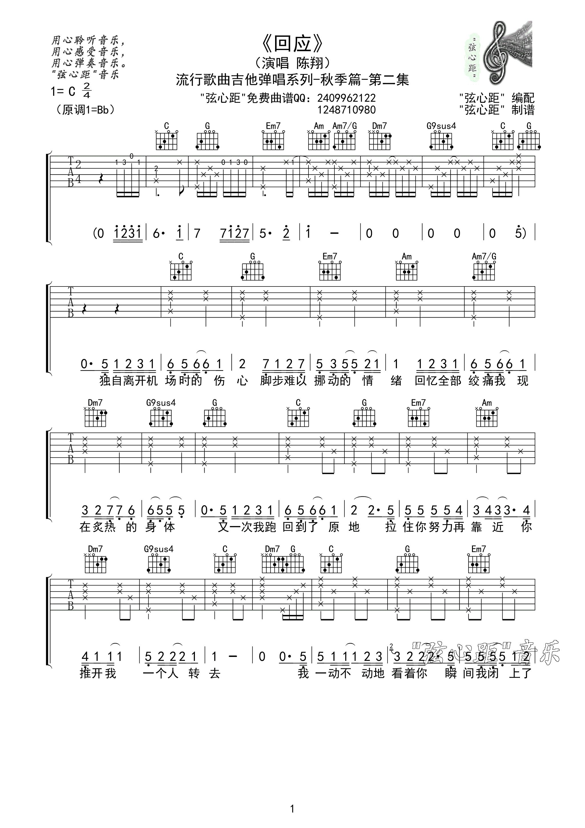 曲谱介绍: 陈翔《回应》吉他弹唱谱,采用C调指法编配,弦心距编配出品,共有3张高清图谱。