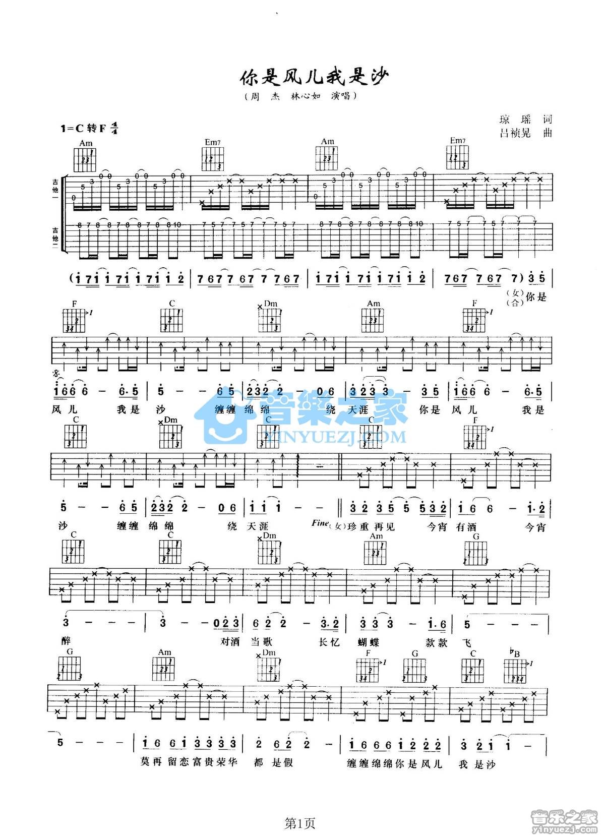 曲谱介绍: 林心如《你是风儿我是沙》吉他弹唱谱,采用C调指法编配,音乐之家编配出品,共有2张高清图谱,免翻页排版设计。