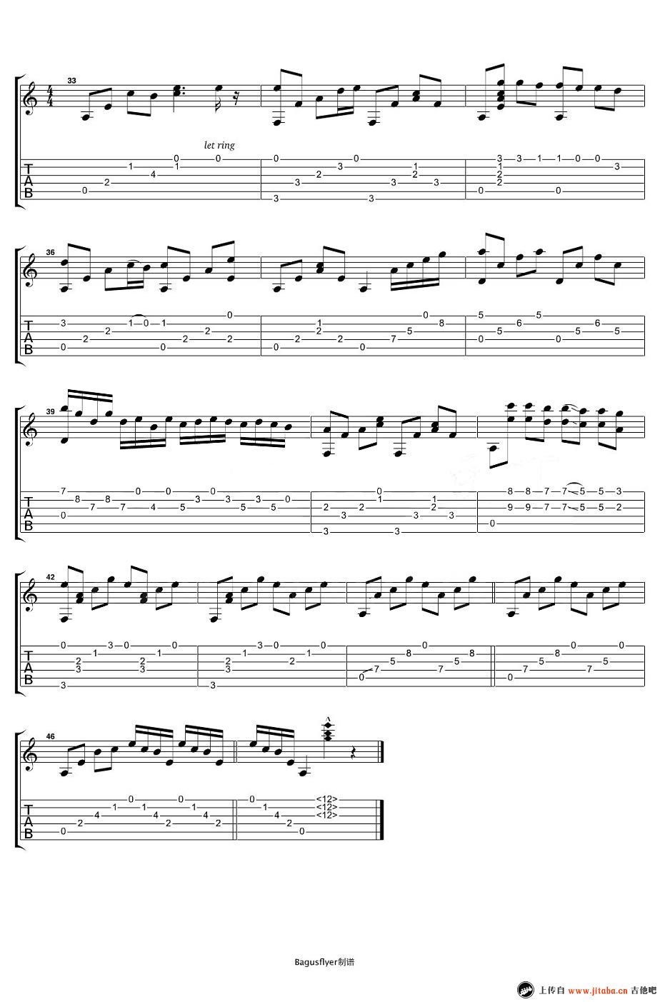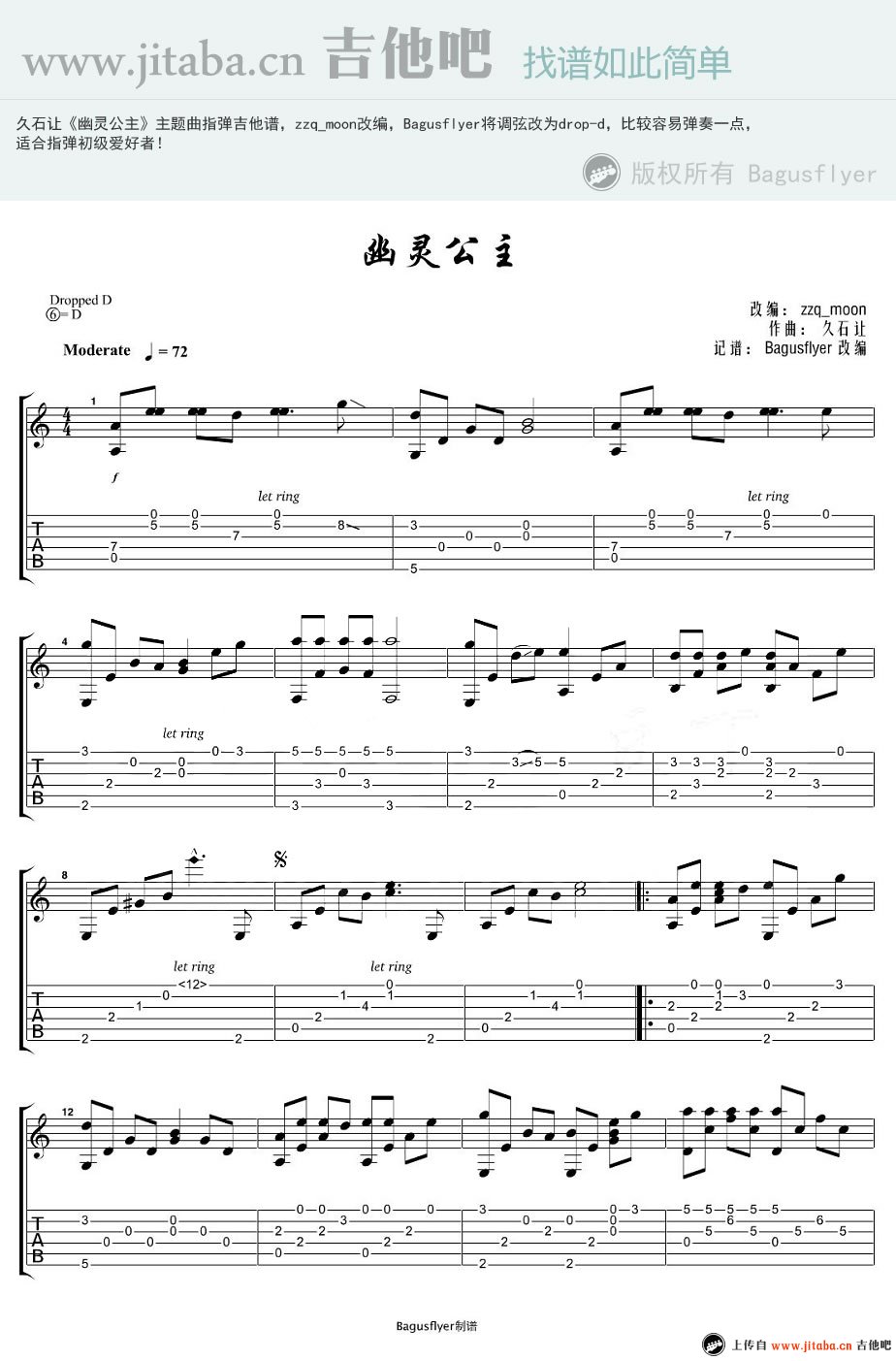 曲谱介绍: 动漫插曲《幽灵公主》吉他独奏谱,共有3张高清图谱。