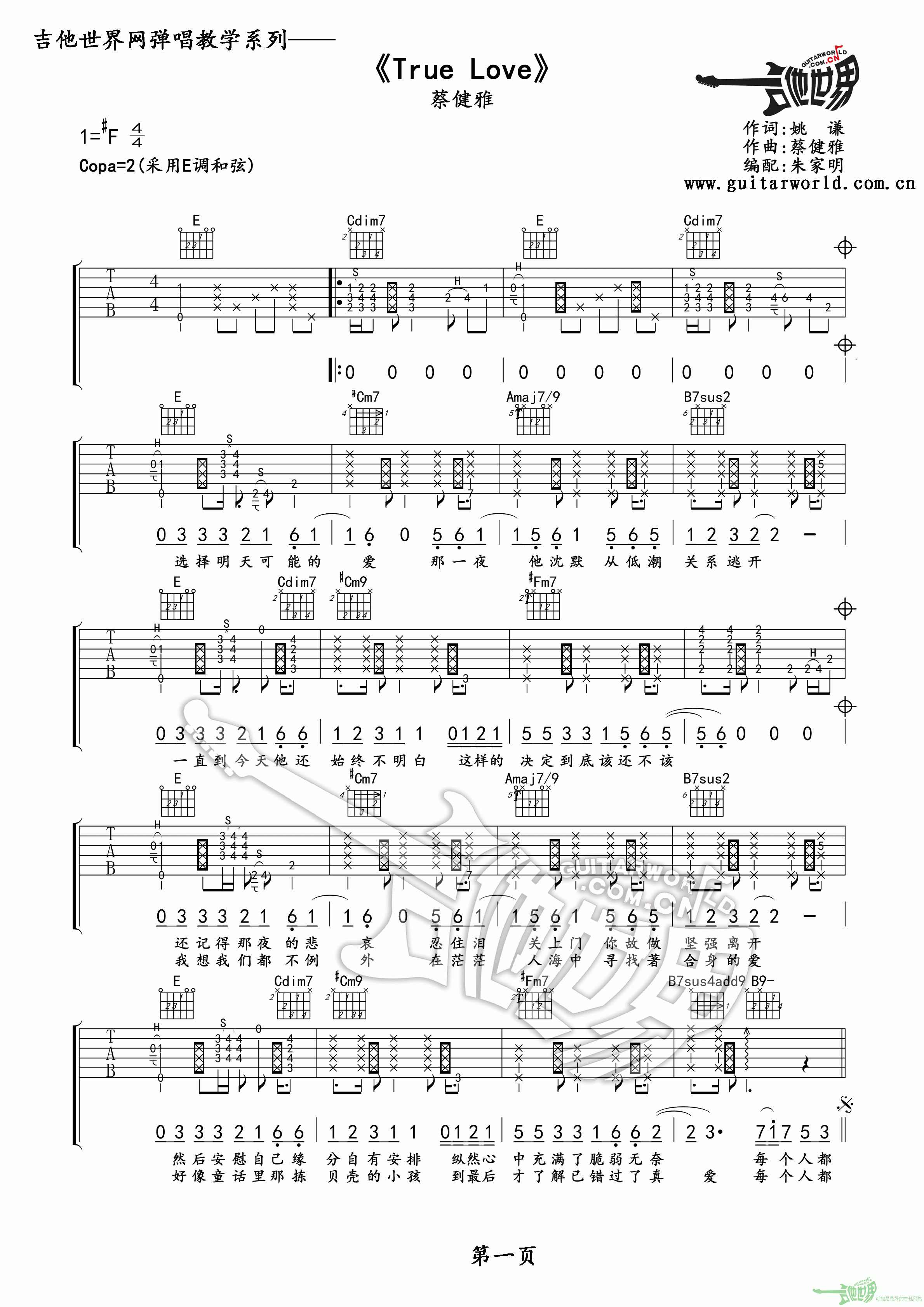 曲谱介绍: True《TrueLove》吉他弹唱谱,采用F调指法编配,吉他世界编配出品,共有2张高清图谱,免翻页排版设计。