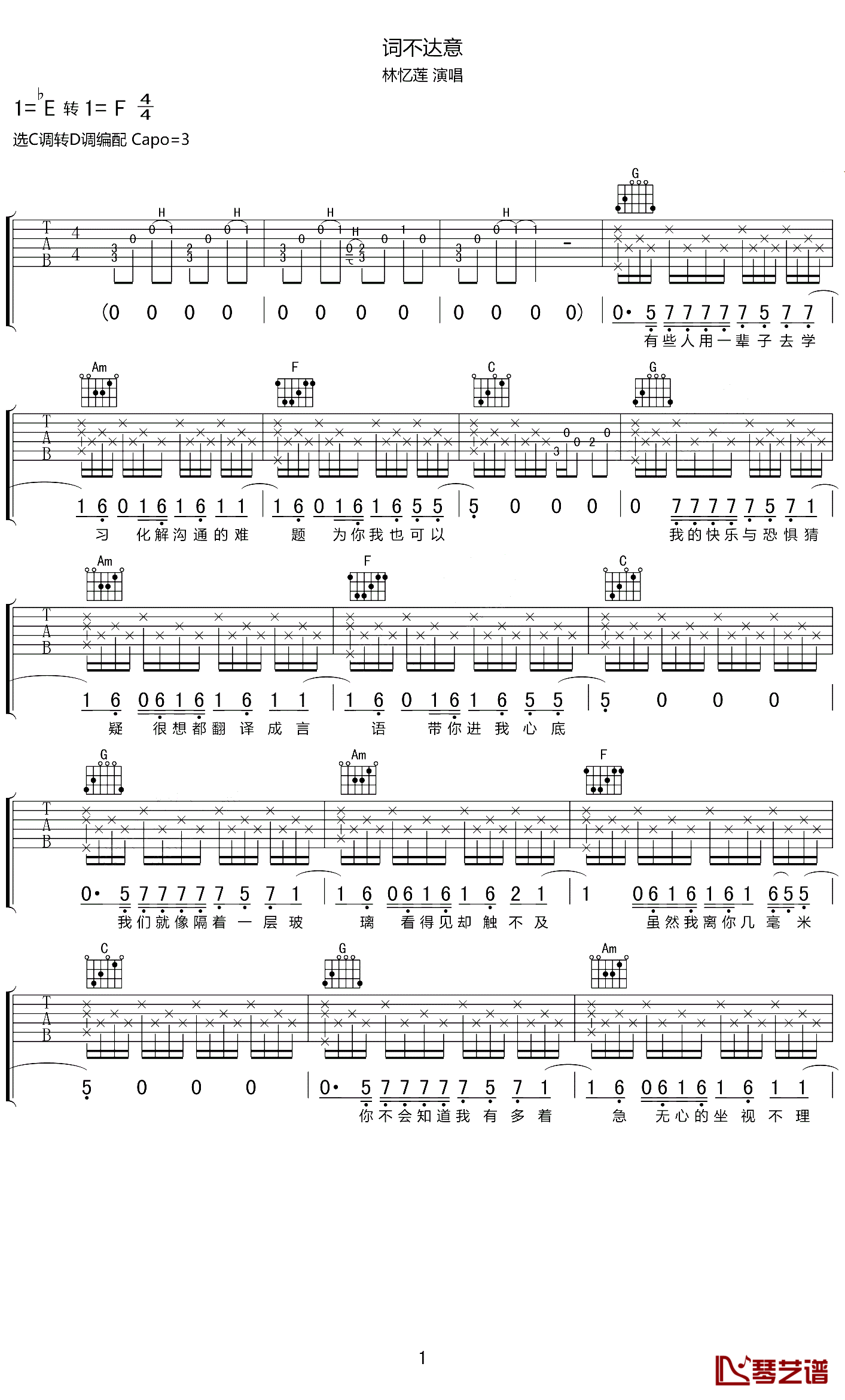 曲谱介绍: 林忆莲《词不达意》吉他弹唱谱,采用C调指法编配,琴艺谱编配出品,共有3张高清图谱。