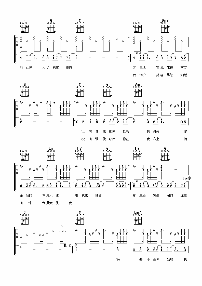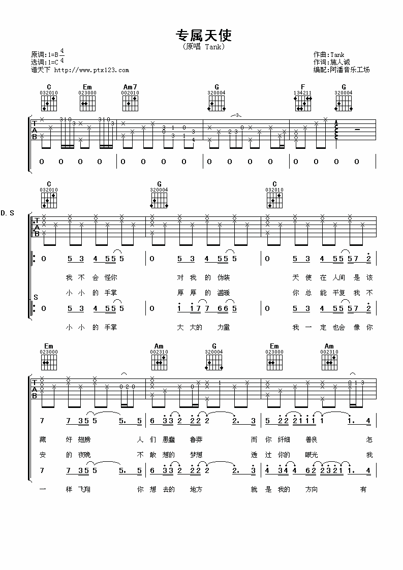 曲谱介绍: tank《专属天使》吉他弹唱谱,采用C调指法编配,阿潘音乐工场编配出品,共有3张高清图谱。