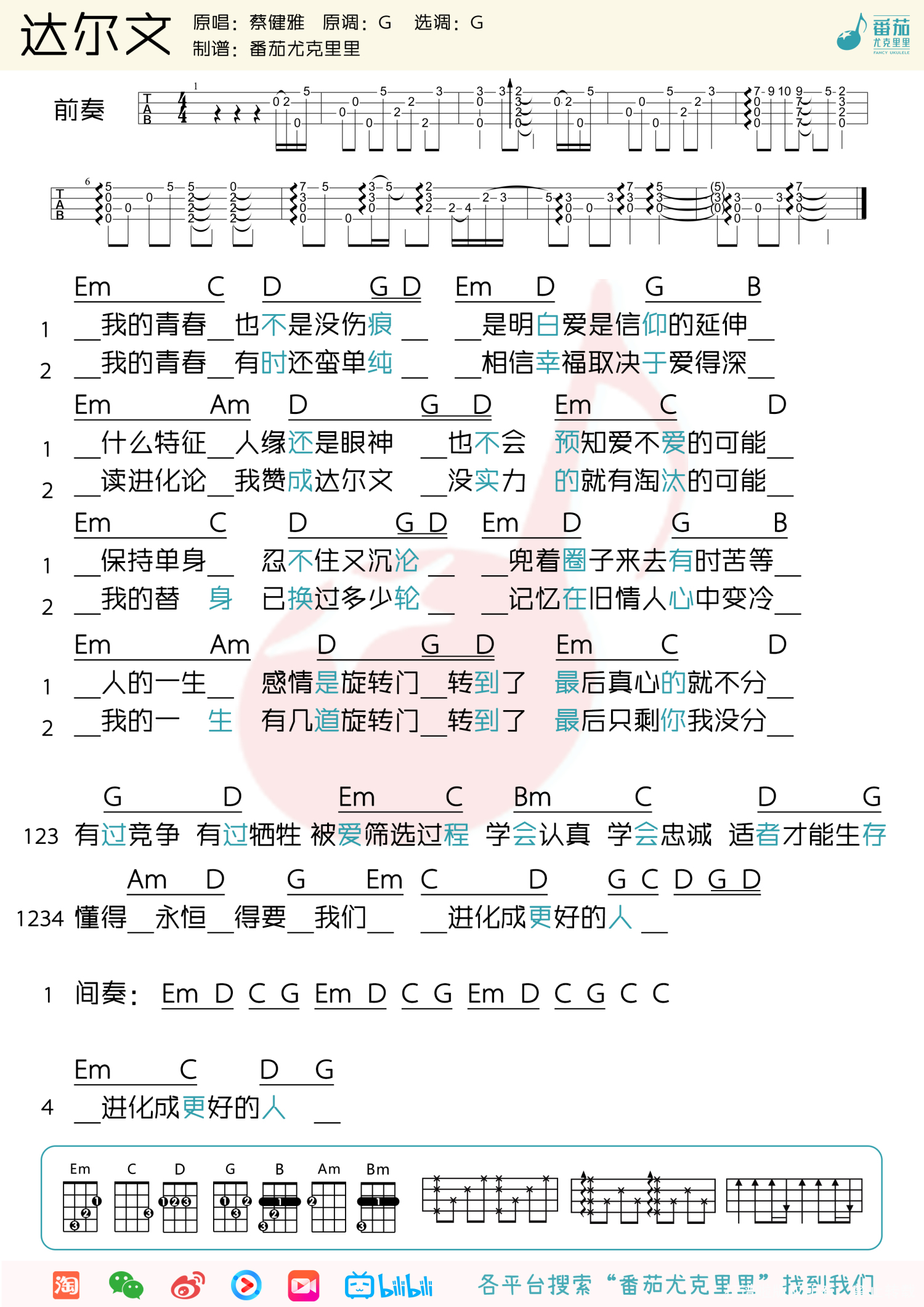曲谱介绍: 达尔文尤克里里教学   达尔文尤克里里谱