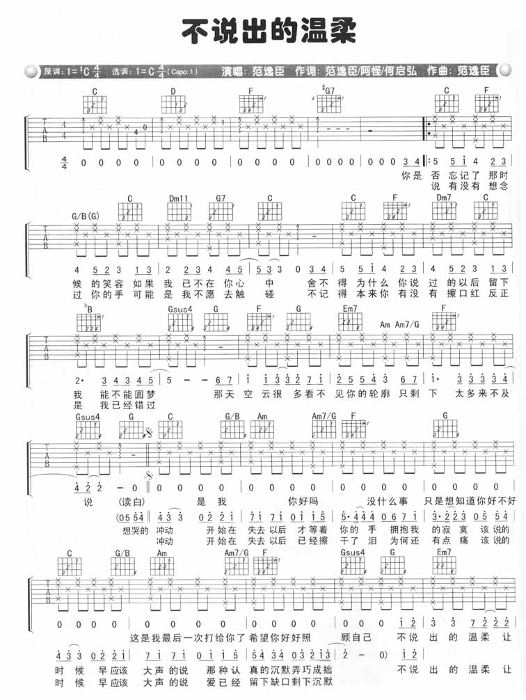 曲谱介绍: 范逸臣《不说出的温柔》吉他弹唱谱,采用C调指法编配,共有2张高清图谱,免翻页排版设计。