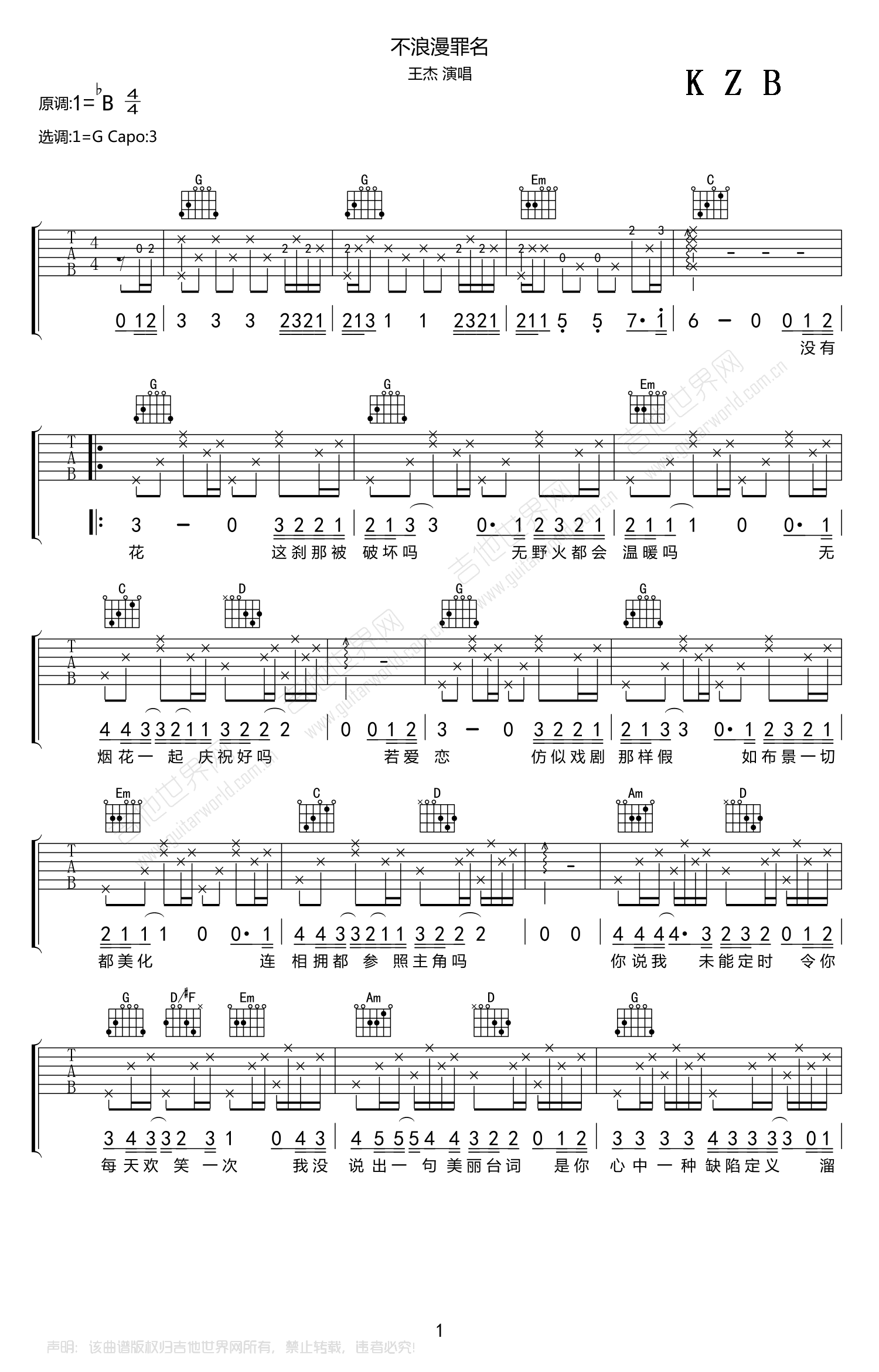 曲谱介绍: 王杰《不浪漫罪名》吉他弹唱谱,采用B调指法编配,吉他世界编配出品,共有2张高清图谱,免翻页排版设计。