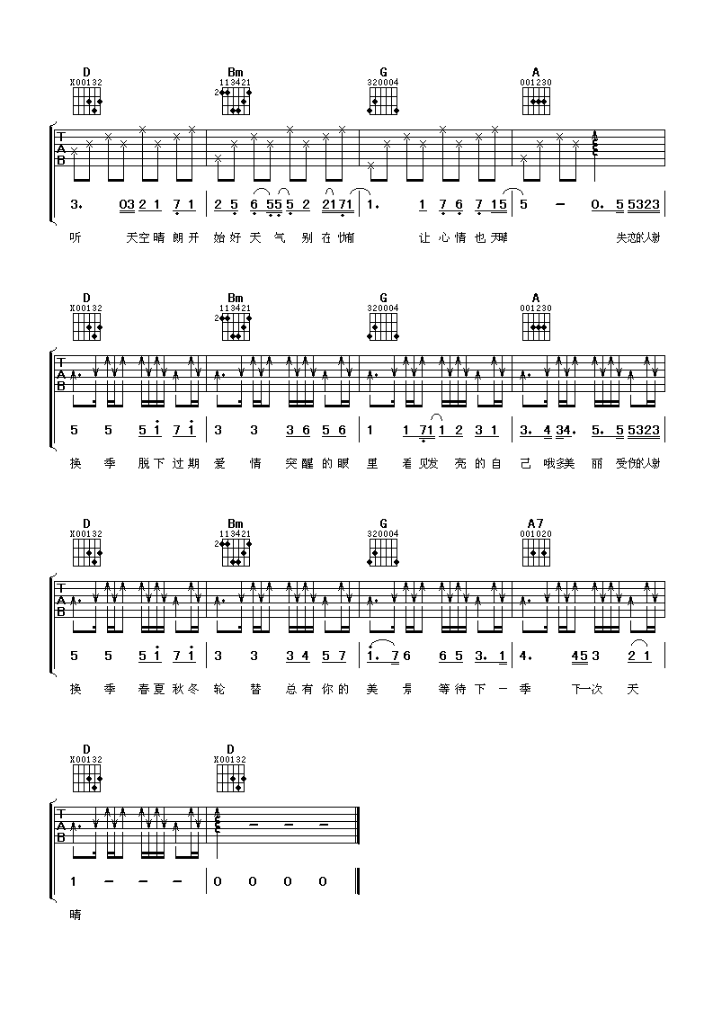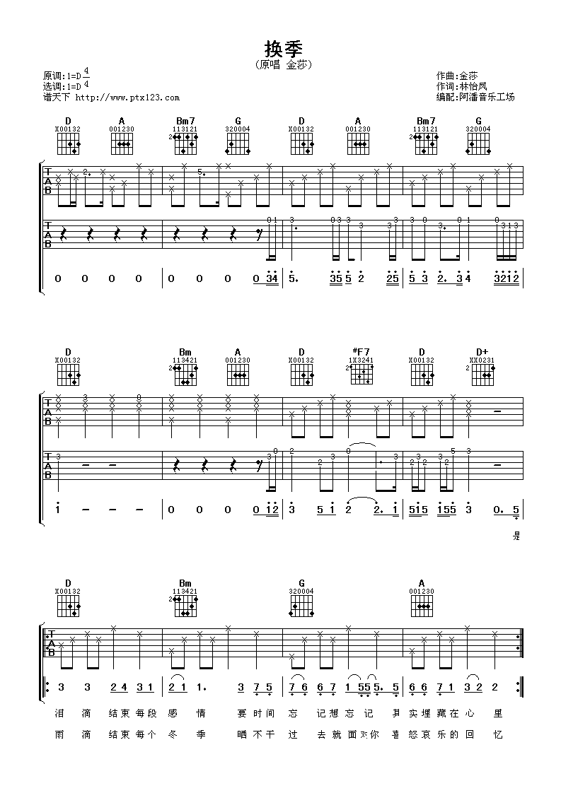 曲谱介绍: 金莎《换季》吉他弹唱谱,采用D调指法编配,阿潘音乐工场编配出品,共有2张高清图谱,免翻页排版设计。