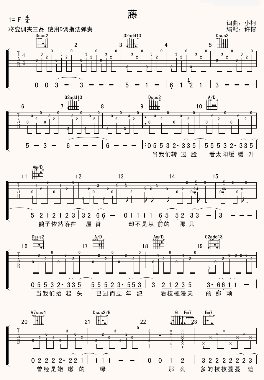 曲谱介绍: 小柯《藤》吉他弹唱谱,采用F调指法编配,许榕编配出品,共有4张高清图谱。