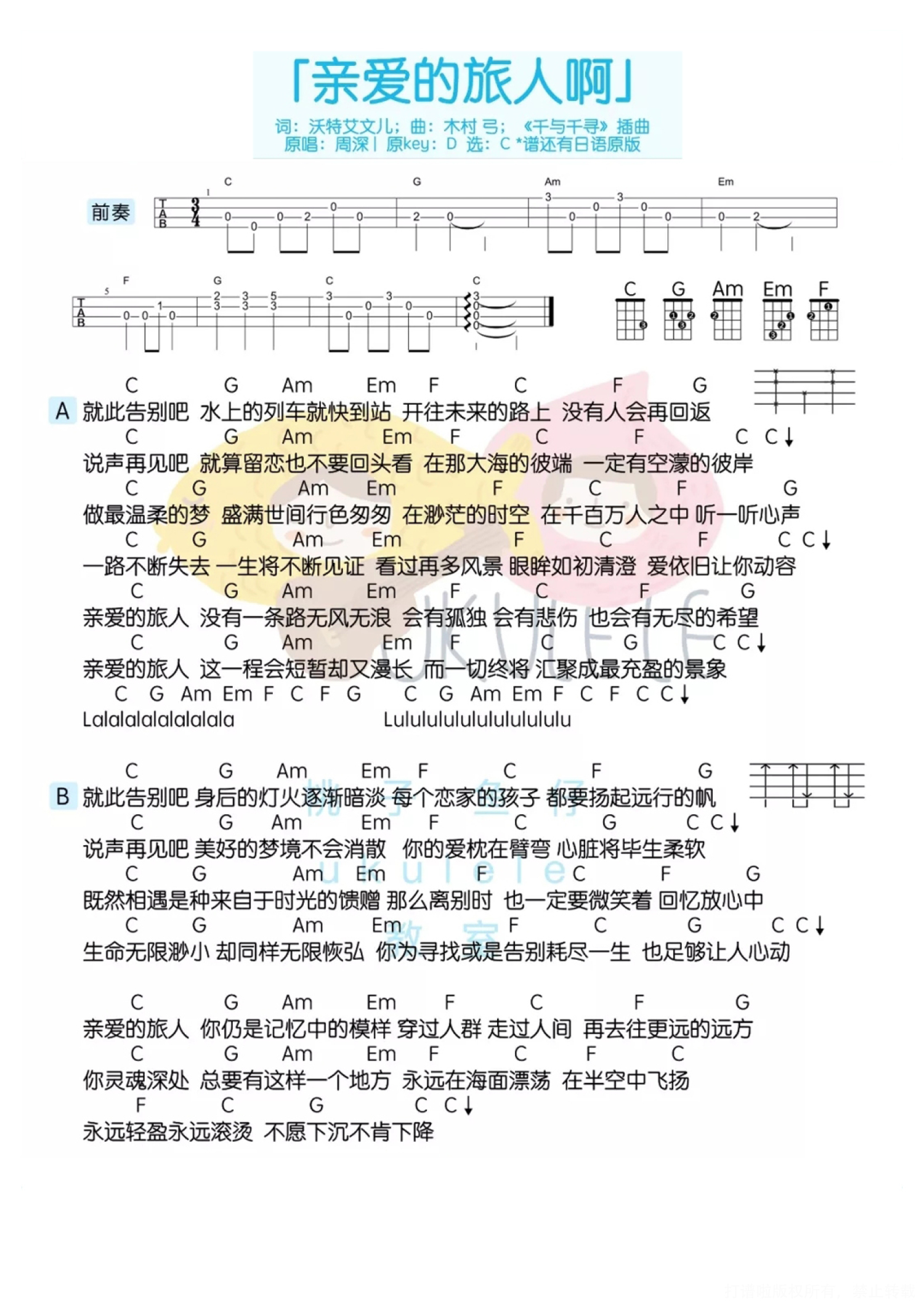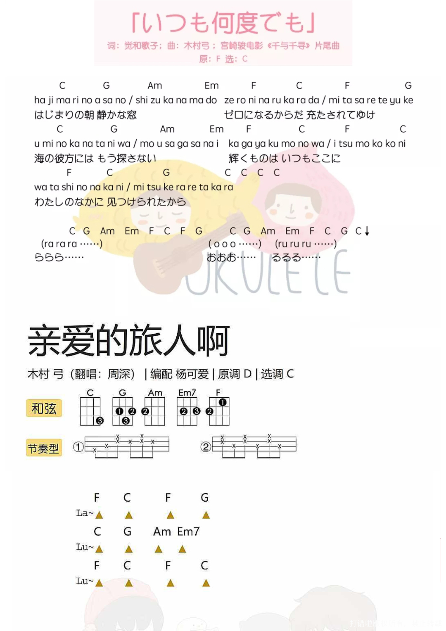 曲谱介绍: 桃子版 趣弹版 目录 桃子版 有一部18年前就已经上映过的动画电影 《千与千寻 /千と千尋の神隠し》 至今仍然霸占日本票房第一的位置 豆瓣电影上已有140万人看过并打出了9.3的高分 它在大多数影迷心中占据着不可替代的位置 现在终于能在影院看到正式国内上映版本了 简直有生之年系列!要哭了!   网友纷纷表示:为了这一天,我们整整等了18年! 连宫崎骏爷爷都为了这次上映, 专门给咱们中国观众画了封超萌的手写信。 (果然是小编心目中萌哒哒的宫崎骏爷爷~) 我们都是被宫崎骏宠爱着的孩子~   亲爱的旅人啊ukulele弹唱教学   亲爱的旅人啊ukulele谱 1、中文版   2、日文版   趣弹版 Aloha~ 最近有一个超令人兴奋的消息 《千与千寻》即将在国内上映! 等了18年,终于能在电影院看了! 想起它一定会想起它的音乐 而周深出于对这部电影的喜爱 将主题曲进行了翻唱 这首「亲爱的旅人啊」 真的太太太好听了! 可爱今天就要教大家弹这首歌~   弹唱演示 亲爱的旅人啊 丨 周深 麻麻再也不用担心我不会日语了!   弹唱教学   亲爱的旅人啊尤克里里谱