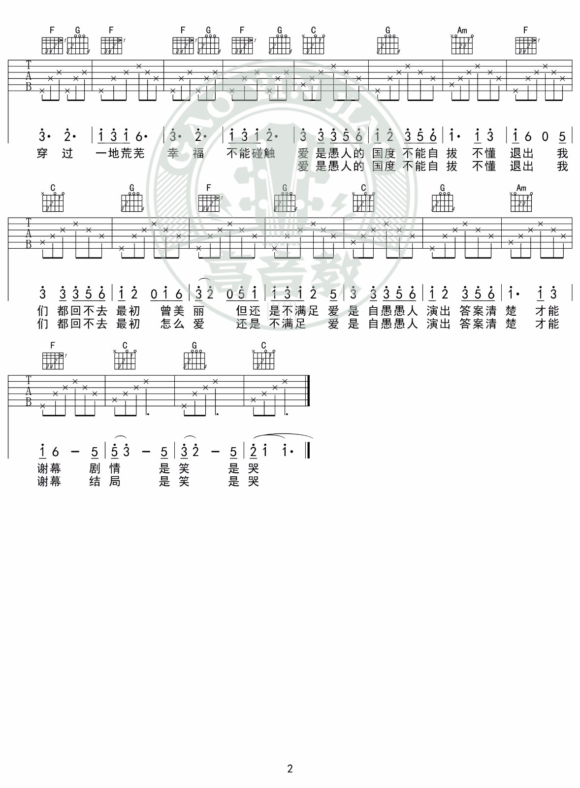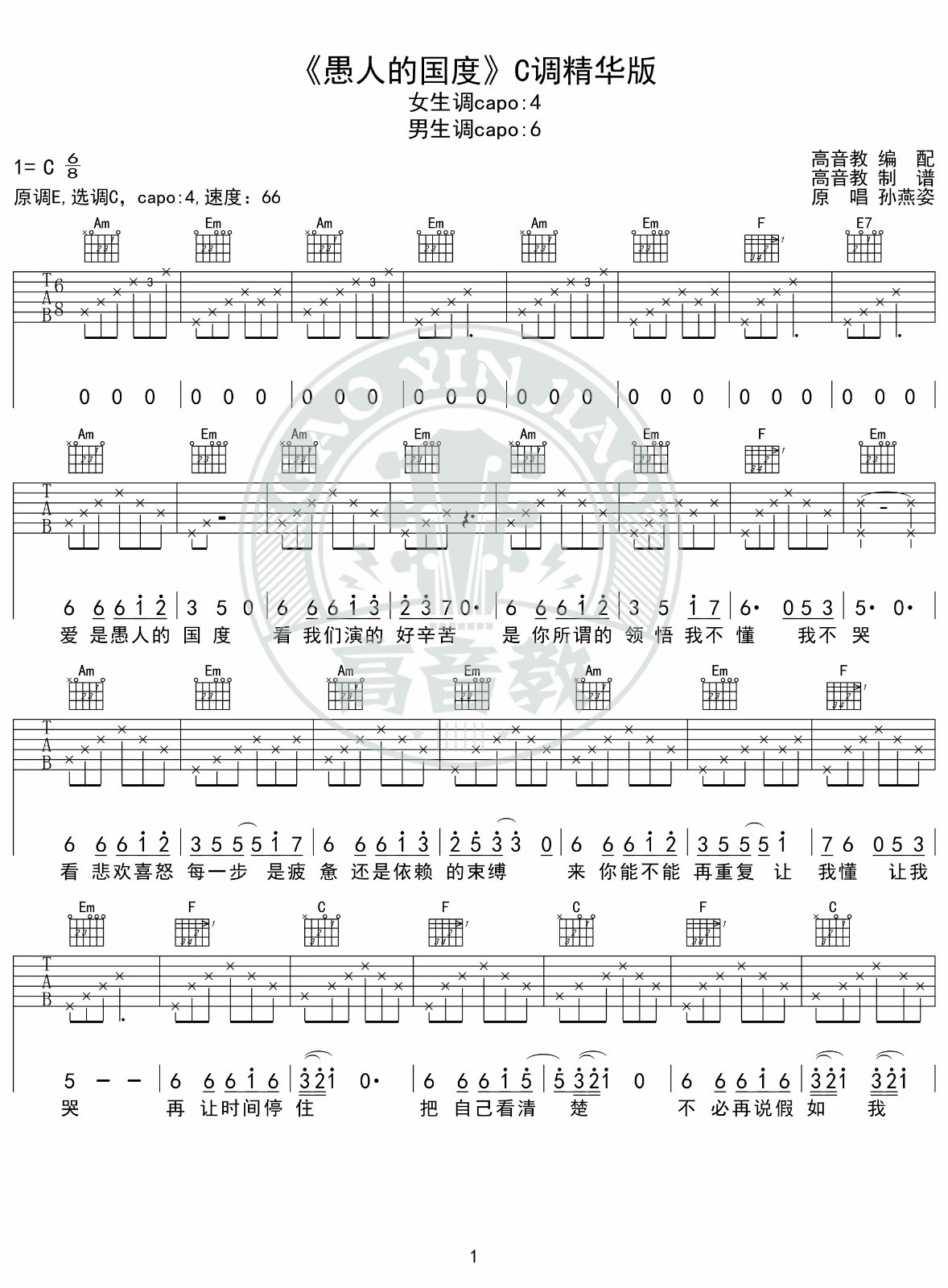 曲谱介绍: 孙燕姿《愚人的国度》吉他弹唱谱,采用C调指法编配,高音教编配出品,共有2张高清图谱,免翻页排版设计。