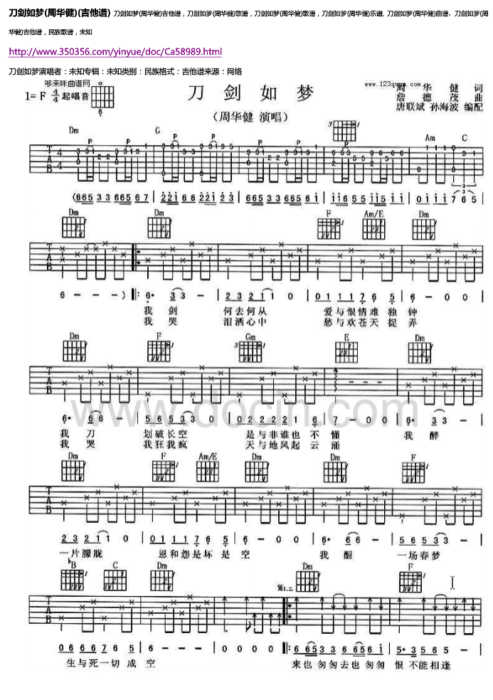 曲谱介绍: 周华健《刀剑如梦》吉他弹唱谱,采用F调指法编配,共有2张高清图谱,免翻页排版设计。