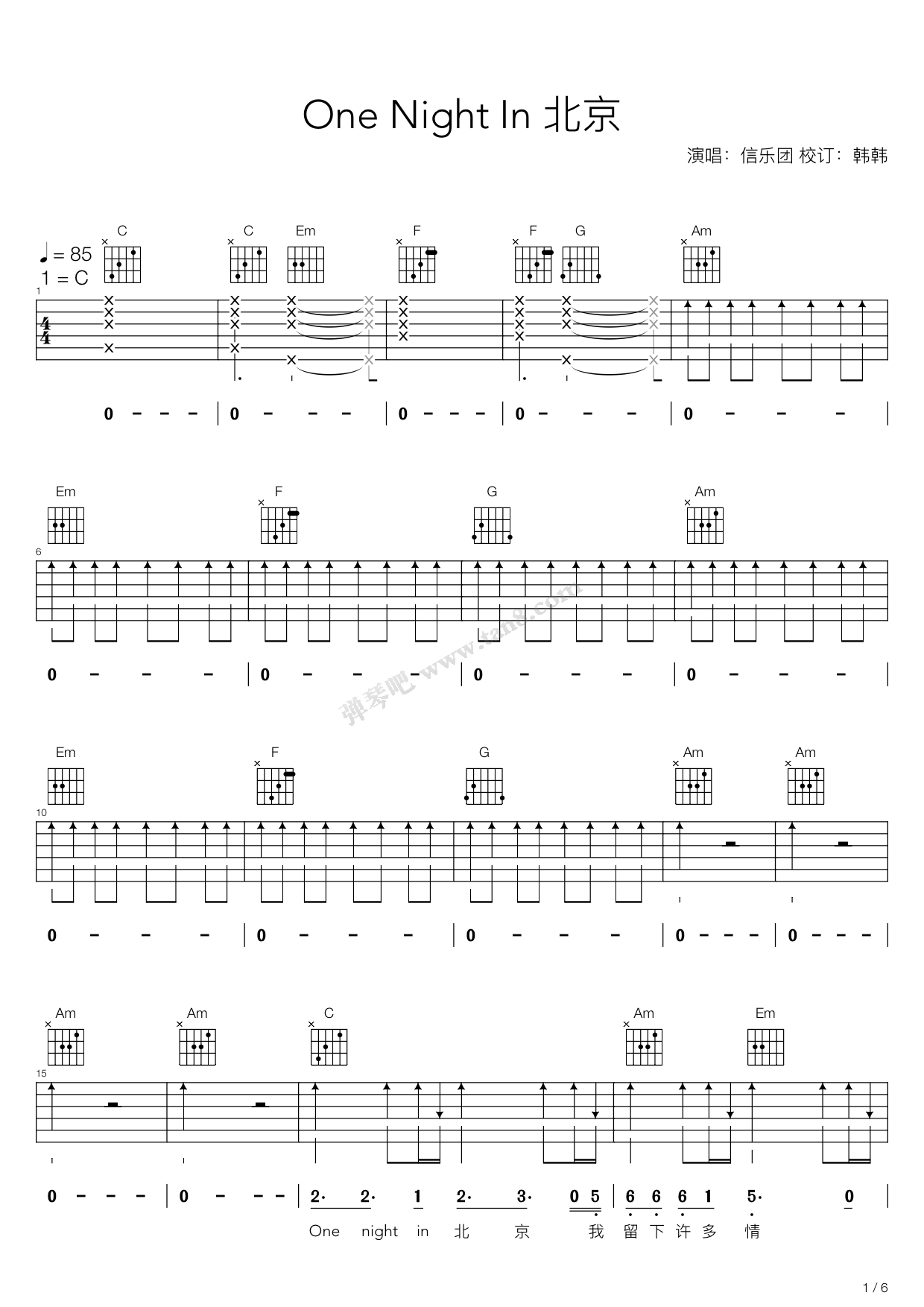 曲谱介绍: 信乐团《北京一夜》吉他弹唱谱,采用C调指法编配,弹琴吧编配出品,共有6张高清图谱。