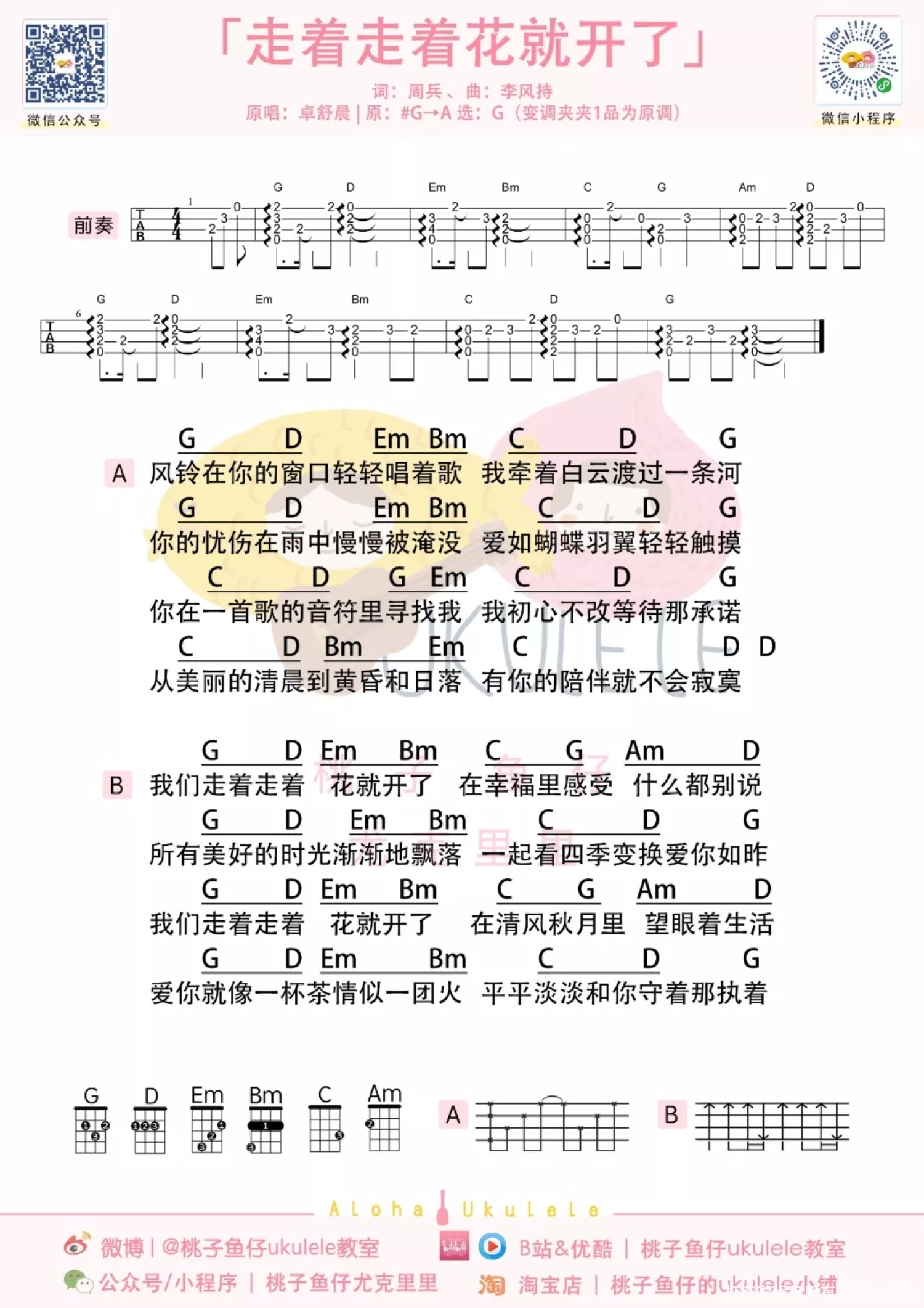曲谱介绍: 我们走着走着 花就开了 在幸福里感受 什么都别说 ● 这是一首超暖心甜蜜的歌曲~甜美的歌声搭配悠扬的旋律,仿佛周围都飘起了粉红泡泡~   《走着走着花就开了》尤克里里弹唱谱