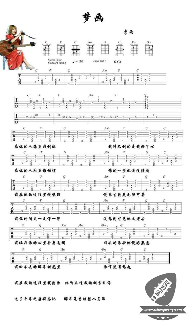 曲谱介绍: 李雨《梦画》吉他弹唱谱,采用C调指法编配,易唱网编配出品,共有1张高清图谱,免翻页排版设计。
