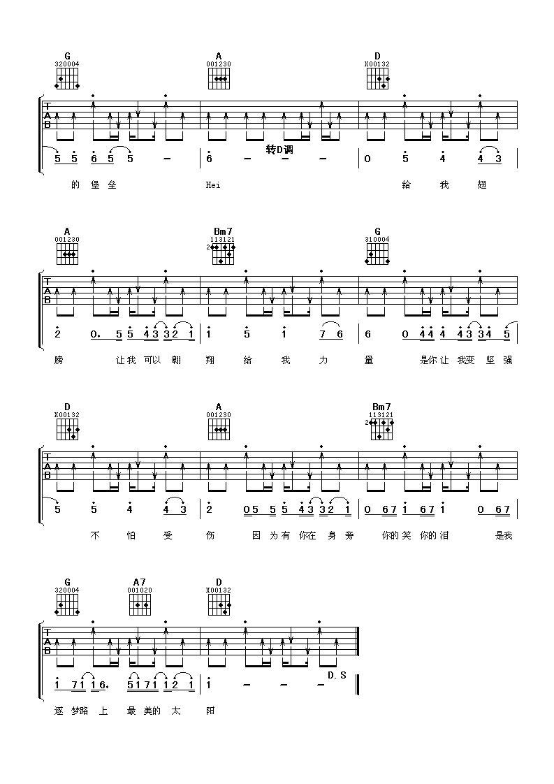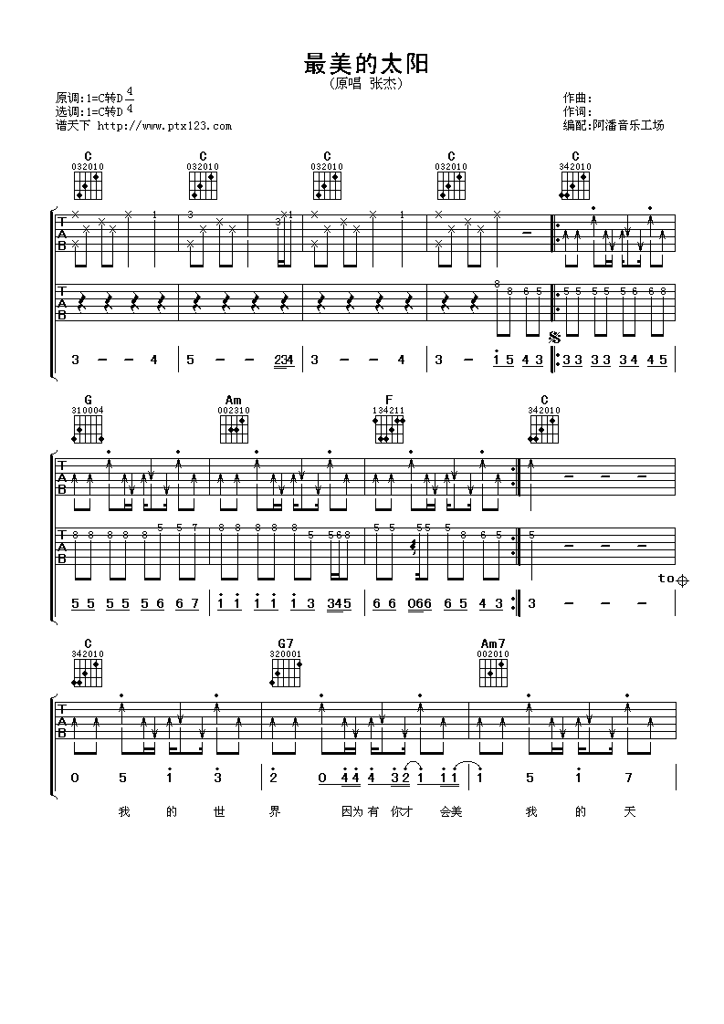 曲谱介绍: 张杰《最美的太阳》吉他弹唱谱,采用D调指法编配,阿潘音乐工场编配出品,共有3张高清图谱。