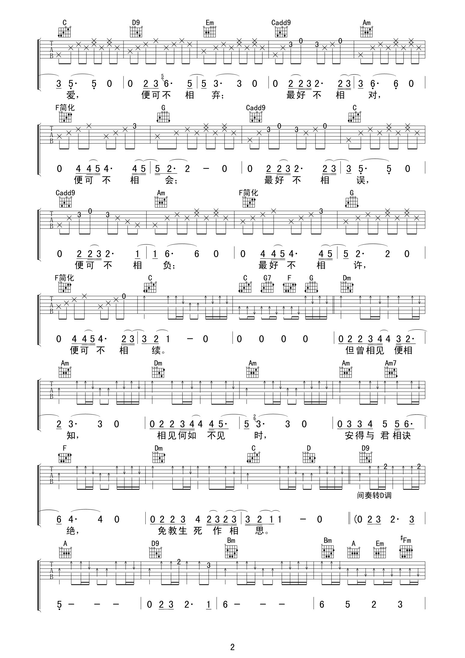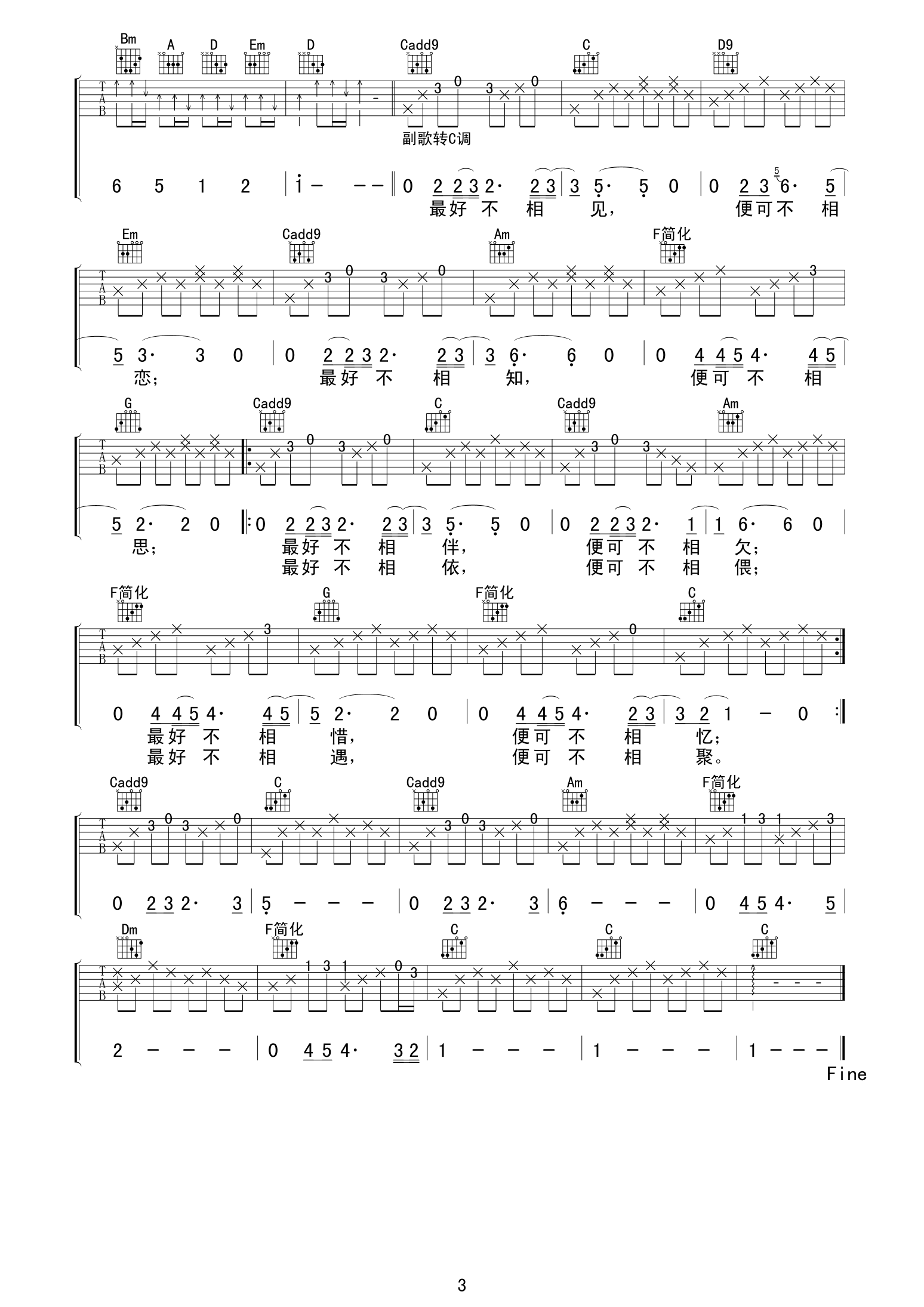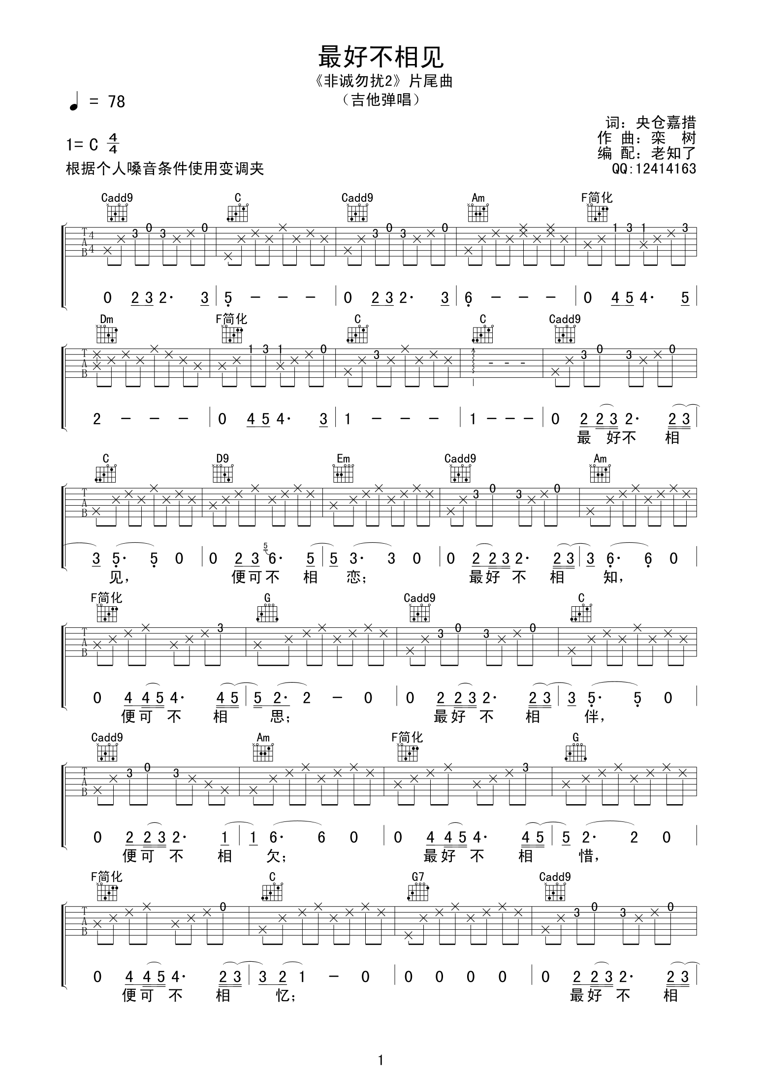 曲谱介绍: 李漠《最好不相见》吉他弹唱谱,采用C调指法编配,老知了编配出品,共有3张高清图谱。