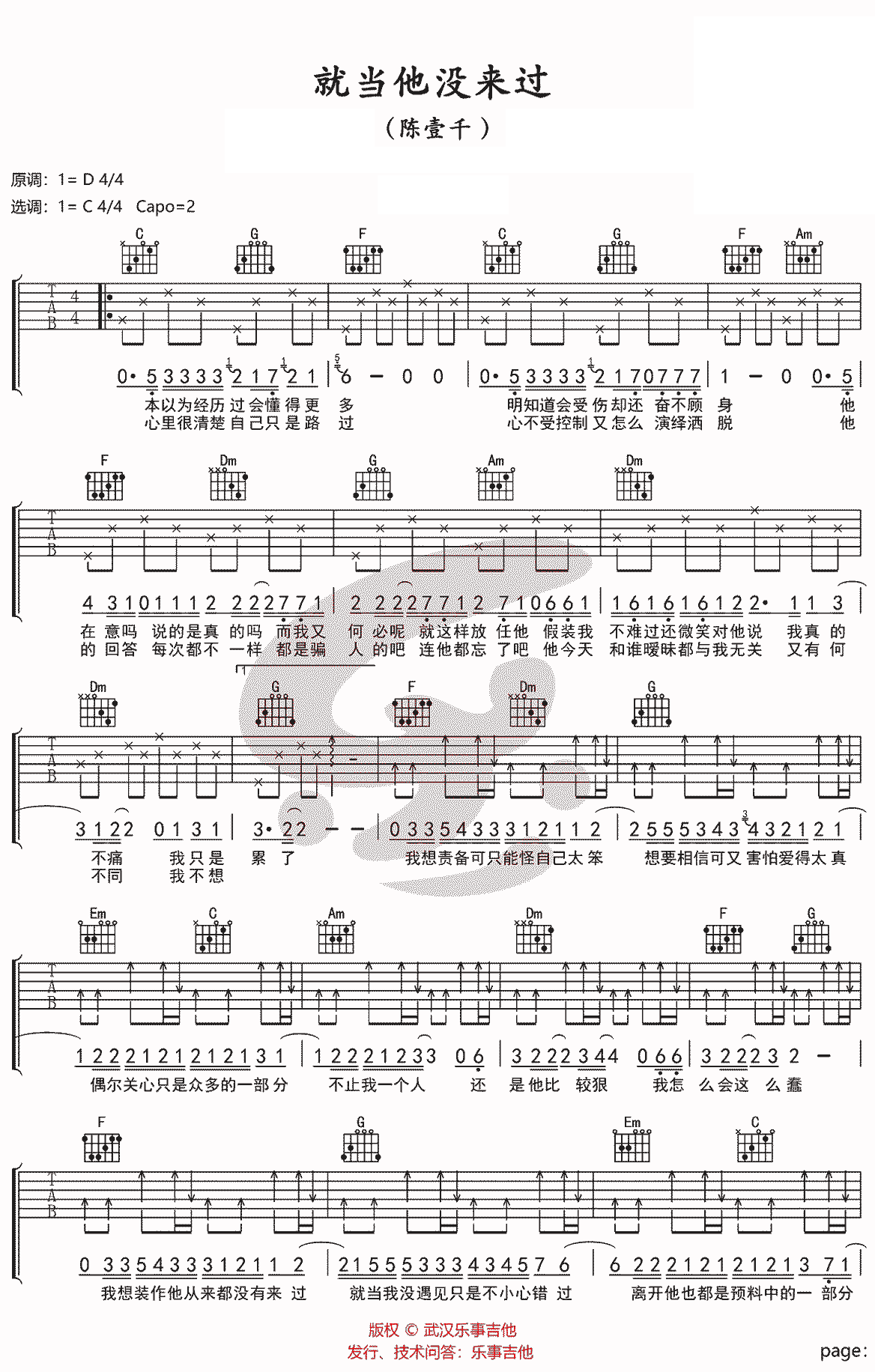 曲谱介绍: 陈壹千《就当他没来过》吉他弹唱谱,采用C调指法编配,共有2张高清图谱,免翻页排版设计。