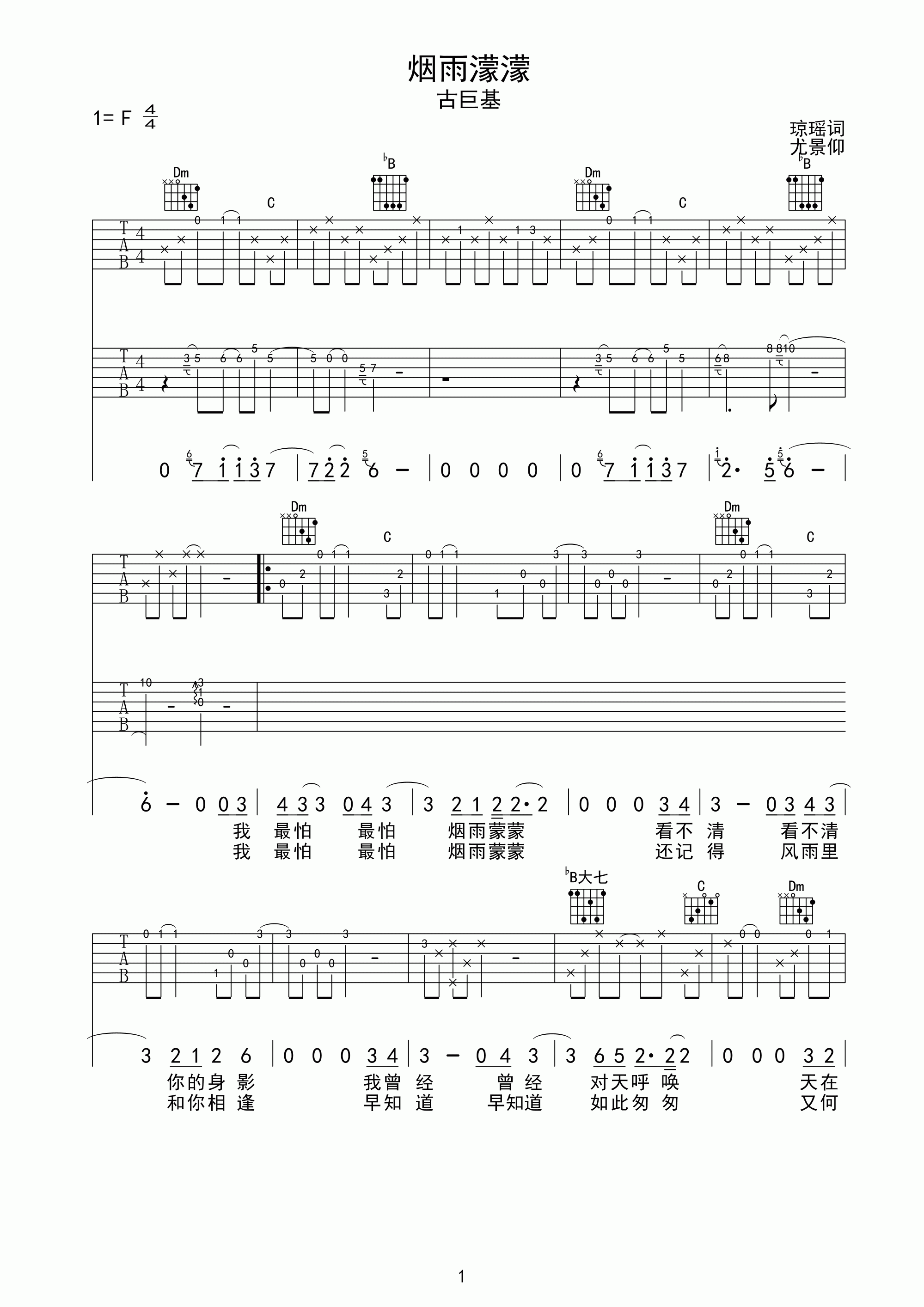 曲谱介绍: 古巨基《烟雨濛濛》吉他弹唱谱,采用F调指法编配,共有2张高清图谱,免翻页排版设计。