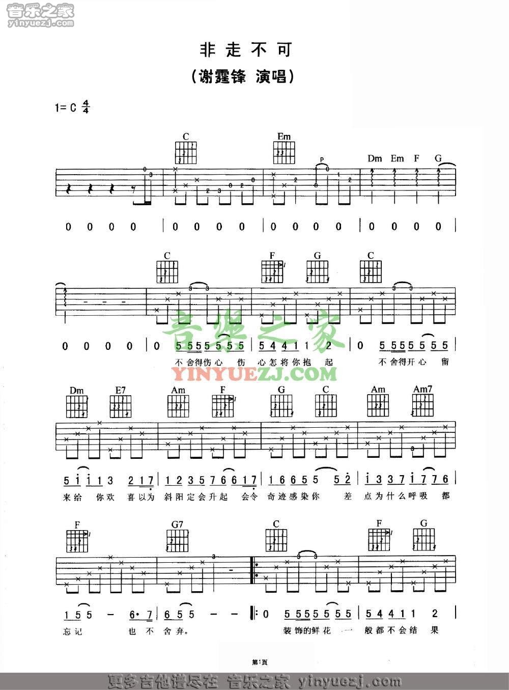 曲谱介绍: 谢霆锋《非走不可》吉他弹唱谱,采用C调指法编配,音乐之家编配出品,共有3张高清图谱。