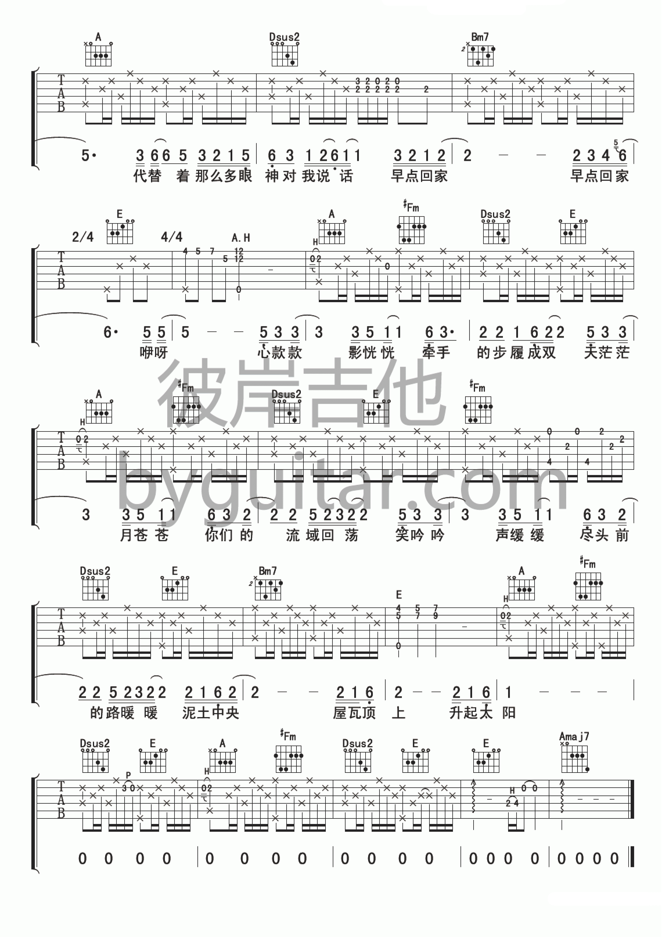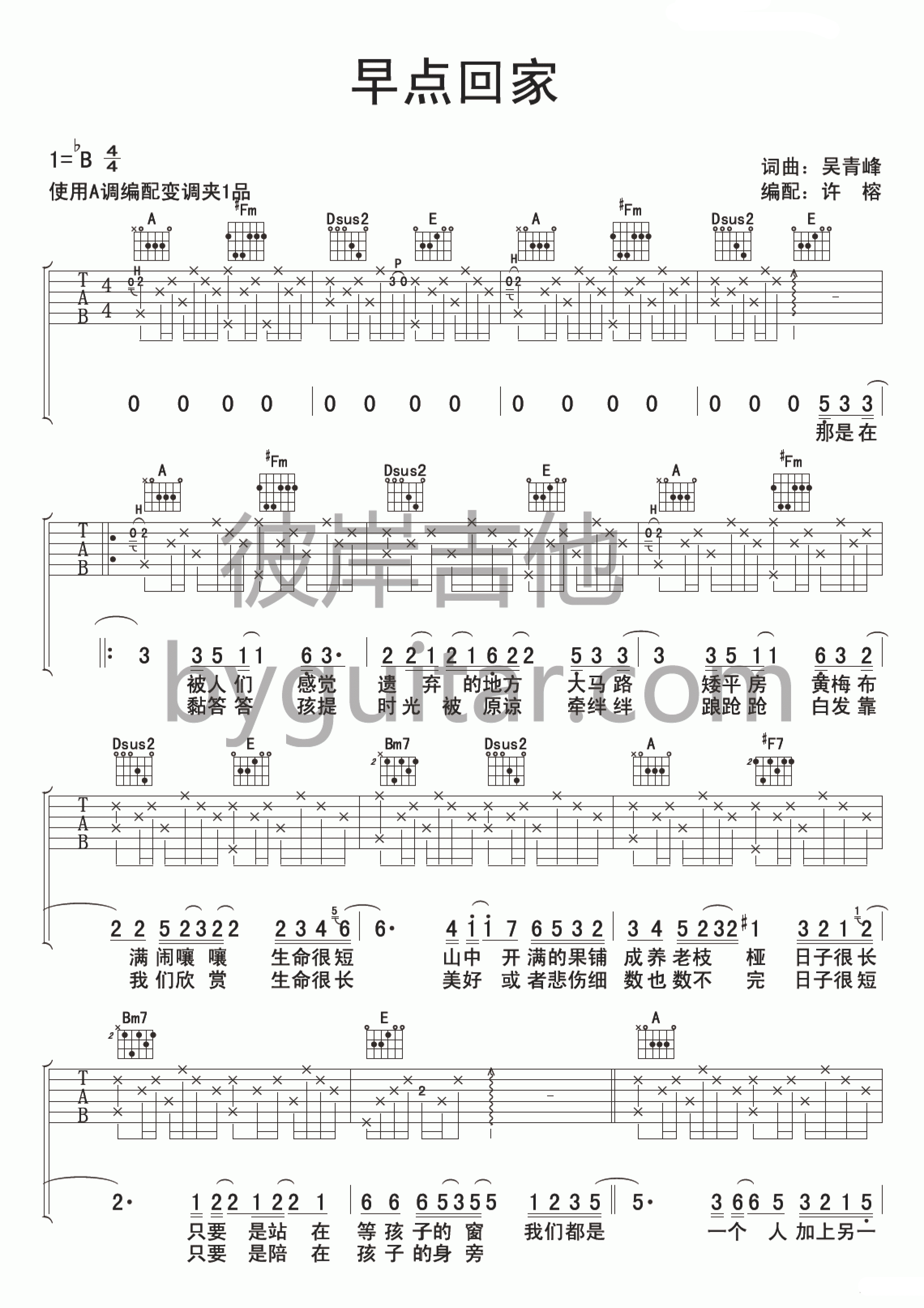 曲谱介绍: 苏打绿《早点回家》吉他弹唱谱,采用B调指法编配,彼岸吉他编配出品,共有3张高清图谱。